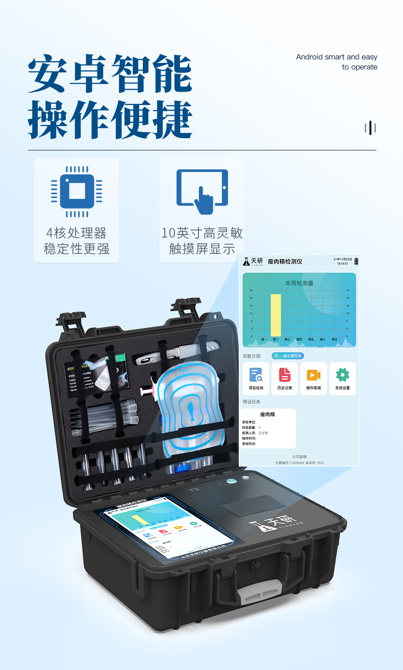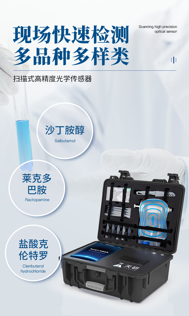 瘦肉精檢測儀可現(xiàn)場快速檢測鹽酸克倫特羅、萊克多巴胺、沙丁胺醇、己烯雌酚、喹乙醇等。儀器預留其他項目檢測程序和端口,根據(jù)日后需求可方便的自主增加檢測項目。日后可升級為檢測抗生素、獸藥殘留、動物疫病、病害肉、的綜合類型儀器