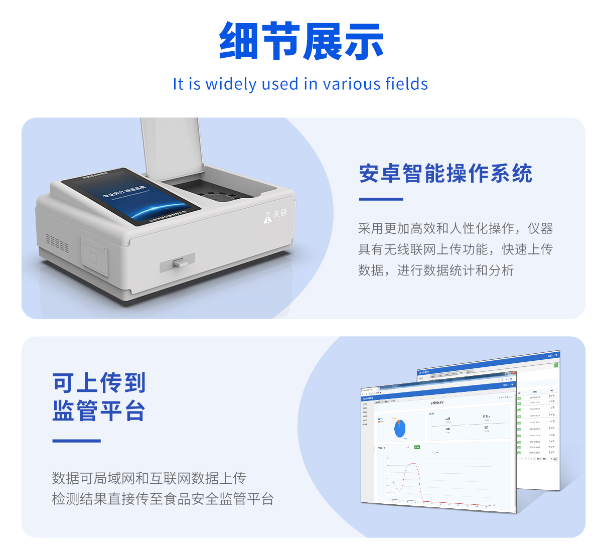 | 儀器采用臺式一體化系統(tǒng)檢測技術(shù),將分光光度模塊、膠體金檢測模塊、新型農(nóng)殘檢測模塊、數(shù)字化管理模塊、無線通訊模塊高度集成于一體,支持檢測200種食品安全檢測項目,同時預(yù)留升級檢測方法。 | 儀器檢測模塊標(biāo)準(zhǔn)化、智能化,可隨意自由組合。檢測箱體內(nèi)置多個標(biāo)準(zhǔn)檢測單元,檢測模塊可以調(diào)整配置。 | 儀器采用全新安卓智能系統(tǒng),主控芯片采用 ARM Cortex-A7,RK3288/4核處理器,10.1寸高清液晶觸摸豎屏,更加**的UI交互界面,運轉(zhuǎn)快捷;儀器配備無線通信模塊: 4G(APN)通訊模塊、Wifi模塊,藍(lán)牙傳輸,同時具有雙USB接口以及RJ45接口能以多種方式實現(xiàn)數(shù)據(jù)保存和數(shù)據(jù)傳輸功能。 | 創(chuàng)新檢測模式: | ★檢測通道:≥12通道;采用精密旋轉(zhuǎn)比色池設(shè)計,使用同芯片同光源校準(zhǔn)精度,解決不同光源之間的誤差值。1-12通道間誤差0.1%。(**號:ZL202022821055.2) | ★儀器具有自動識別比色皿檢測功能,即:將樣品比色皿放入儀器后,點擊樣品檢測,儀器自動識別比色皿進(jìn)行通道檢測。 | 進(jìn)口高精光源: | 高精度進(jìn)口四波長冷光源,通道配置 410、520、590、630nm 波長光源,一個光源芯片驅(qū)動一個光源,誤差極小,每臺設(shè)備單獨**校準(zhǔn)光源,**比對,同時參照四種不同波段光源全方位覆蓋市面上99%的農(nóng)殘食品項目檢測。 | 膠體金模塊檢測方式: | 采用COMS實時成像技術(shù),可采集多個畫面,支持3個金標(biāo)同時讀卡,通過不同顏色的灰度變化,一秒精準(zhǔn)得出結(jié)果。 | 智能化操作系統(tǒng): | 便捷操作系統(tǒng):設(shè)備檢測時可在同一檢測界面自動對應(yīng)相關(guān)檢測通道一次性選擇1-12個樣品名稱,無須退出界面,節(jié)省操作時間。 | 數(shù)據(jù)集成系統(tǒng):設(shè)備首頁自動統(tǒng)計檢測數(shù)據(jù)包含:周檢測數(shù)據(jù)、月檢測數(shù)據(jù),全部檢測總數(shù)量,均包含檢測總數(shù),合格數(shù),不合格數(shù),以及相關(guān)柱形分析圖,對各項檢測數(shù)據(jù)清晰掌握,無需電腦查詢,更加快捷直觀。 | 項目預(yù)設(shè)系統(tǒng):支持添加單個及多個相同或不相同的任務(wù)預(yù)設(shè),一鍵快速調(diào)取,每一個任務(wù)分別可以設(shè)置不同的樣品、批次、編號、來源、備注、抽樣信息、檢測信息、受檢信息、復(fù)核信息等更多信息。無縫鏈接平臺和APP實時查看下發(fā)任務(wù)。 | 數(shù)據(jù)監(jiān)管系統(tǒng):同步對接監(jiān)管平臺,數(shù)據(jù)可局域網(wǎng)和互聯(lián)網(wǎng)數(shù)據(jù)上傳,檢測結(jié)果可選擇直接傳至食品安全監(jiān)管平臺。集成OSS輸出存儲服務(wù)、區(qū)分設(shè)備定向管理應(yīng)用,進(jìn)行區(qū)域食品安全監(jiān)管及大數(shù)據(jù)分析處理與數(shù)據(jù)統(tǒng)計,檢測區(qū)域食品安全長短期動態(tài),達(dá)到食品安全問題預(yù)估、預(yù)警。 | 自定義打印系統(tǒng):內(nèi)置全新打印系統(tǒng),新創(chuàng)自定義打印方式,可按需靈活設(shè)置開啟或關(guān)閉:產(chǎn)品合格證(國家農(nóng)業(yè)部標(biāo)準(zhǔn)要求),二維碼,抽樣信息、檢測信息,受檢信息、復(fù)核信息、抽樣日期、檢測日期等信息的打印。 | 系統(tǒng)遠(yuǎn)程更新功能:可定向分客戶分儀器更新系統(tǒng),按照不同客戶后期實際需求添加項目,無需機(jī)器返廠,即可遠(yuǎn)程實時升級全新系統(tǒng),節(jié)省時間成本及避免運輸造成設(shè)備損壞。 | 儀器主機(jī)采用一體化防水、抗壓、防撞擊、防腐蝕箱體設(shè)計,同時配備交直流供電,可連接車載電源,可選配大容量充電鋰電池,滿足現(xiàn)場野外檢測需求。 | 安全證書,放心保障:儀器具有中國計量科學(xué)研究院校準(zhǔn)證書,**認(rèn)證。 |
