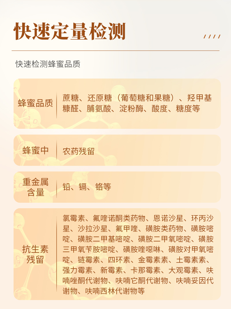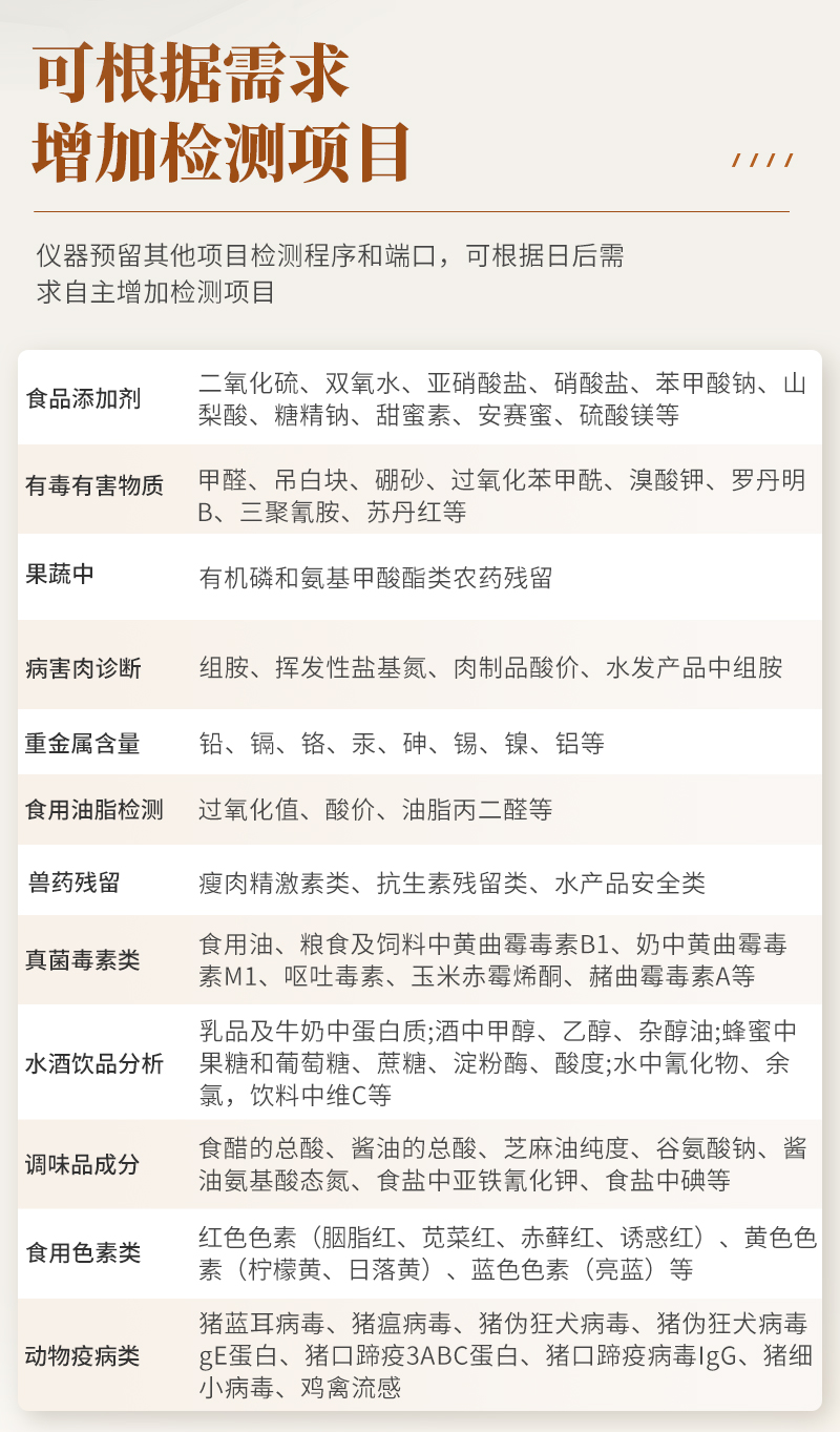 | 食品添加劑:二氧化硫、雙氧水、亞硝酸鹽、硝酸鹽、苯甲酸鈉、山梨酸鉀、糖精鈉、甜蜜素、木耳硫酸鎂等 | 有毒有害物質(zhì):甲醛、吊白塊、硼砂、過氧化苯甲酰、溴酸鉀、羅丹明B、三聚氰胺、蘇丹紅、工業(yè)堿、尿素、明礬等 | 果蔬:農(nóng)藥殘留(酶抑制率法) | 病害肉診斷:組胺、揮發(fā)性鹽基氮; | 重金屬含量:鉛、鎘、鉻、汞、砷、錫、鎳、鋁等; | 食用油脂: 過氧化值、酸價等 | 瘦肉精激素類(獸藥):鹽酸克倫特羅、沙丁胺醇、萊克多巴胺、己烯雌酚等 | 抗生素殘留類(獸藥):四環(huán)素類、硝基呋喃類、磺胺類、β-興奮劑類、沙星類、磺胺類、喹諾酮類,甲砜霉素,氟苯尼考,金剛烷胺、替米考星、慶大霉素、林可霉素、鏈霉素、恩諾沙星、環(huán)丙沙星、頭孢啦啶、青霉素、阿莫西林等 | 真菌毒素類:食用油、糧食及飼料中黃曲霉毒素B1、黃曲霉毒素總量,奶中黃曲霉毒素M1、嘔吐毒素、玉米赤霉烯酮、赭曲霉毒素A、T2毒素、伏馬毒素等; | 水酒飲品分析:酒中甲醇、乙醇、乳品及牛奶中蛋白質(zhì), | 調(diào)味品成分:食醋的總酸、醬油的總酸、芝麻油純度、谷氨酸鈉、醬油氨基酸態(tài)氮、食鹽中亞鐵氰化鉀、食鹽中碘等 | 食用色素類:紅色色素(胭脂紅、莧菜紅、赤蘚紅、誘惑紅)、黃色色素(檸檬黃、日落黃)、藍色色素(亮藍)等 | 動物疫病類:禽流感、新城疫、牛羊口蹄疫、牛羊結核病、牛羊包蟲、牛羊布病、小反芻獸、豬藍耳病毒、豬瘟病毒、豬偽狂犬病毒、豬細小、豬圓環(huán)、犬細小病毒、犬瘟熱病毒、犬狂犬病毒等; | 蜂蜜成分:果糖和葡萄糖、蔗糖、淀粉酶、酸度等 | 水產(chǎn)品安全類:孔雀石綠、氯霉素、呋喃妥因、呋喃西林、呋喃它酮、呋喃唑酮等 | 蛋類藥物殘留:氯霉素,四環(huán)素,磺胺類,喹諾酮類,呋喃西林,呋喃它酮,呋喃妥因,呋喃唑酮,氟苯尼考,阿莫西林、頭孢氨芐、紅霉素、鏈霉素等 |
