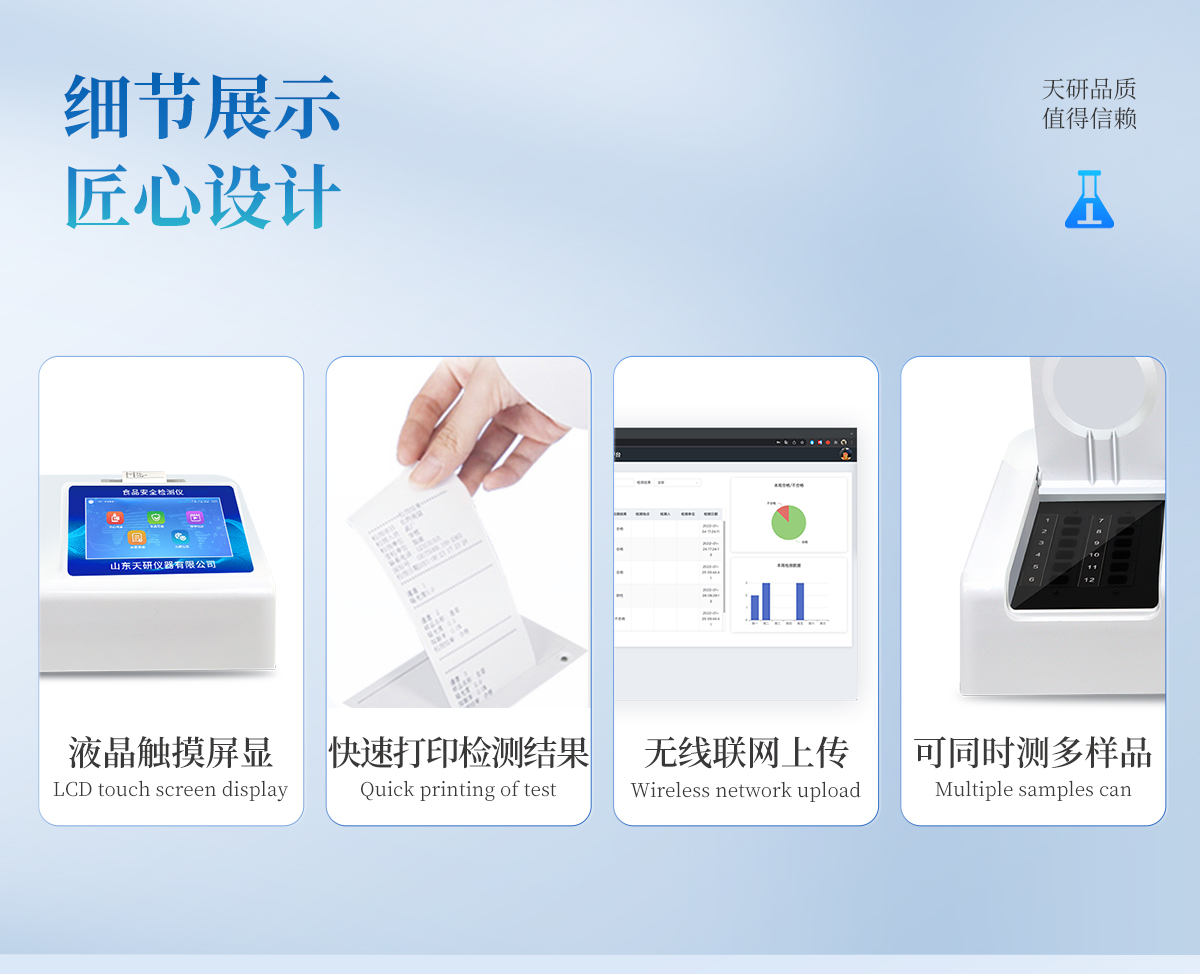 | 安卓智能操作系統(tǒng),采用更加**和人性化操作,儀器具有網(wǎng)線連接、wifi聯(lián)網(wǎng)上傳、GPRS無線遠(yuǎn)傳功能,快速上傳數(shù)據(jù)。 | 智能化程度高,儀器具有自檢功能:具有開機(jī)自檢和調(diào)零功能,具有自動(dòng)檢測(cè)重復(fù)性功能。 | 檢測(cè)通道:≥12個(gè)檢測(cè)通道,可以同時(shí)測(cè)試多個(gè)樣品,每個(gè)樣品由程序控制分別獨(dú)立工作,不會(huì)互相干擾。 | 顯示方式:≥8英寸液晶觸摸屏顯示,人性化中文操作界面,讀數(shù)直觀、簡(jiǎn)單。 | 配備新一代嵌入式熱敏打印機(jī),可選擇手動(dòng)打印或者自動(dòng)打印,檢測(cè)完成可自動(dòng)打印檢測(cè)報(bào)告和二維碼。 | 光源采用進(jìn)口超高亮發(fā)光二極管,高精度、穩(wěn)定性強(qiáng)、光源可控、可以關(guān)掉不使用的光源,功耗更低。 | 采用USB2.0接口設(shè)計(jì),方便數(shù)據(jù)的存貯和移動(dòng),并可隨時(shí)與計(jì)算機(jī)直接相連,并且可用計(jì)算機(jī)控制儀器。實(shí)現(xiàn)數(shù)據(jù)查詢、瀏覽、分析、統(tǒng)計(jì)、打印等。 | 儀器帶有監(jiān)管平臺(tái)。數(shù)據(jù)可局域網(wǎng)和互聯(lián)網(wǎng)數(shù)據(jù)上傳,檢測(cè)結(jié)果直接傳至食品安全監(jiān)管平臺(tái)。進(jìn)行區(qū)域食品安全監(jiān)管及大數(shù)據(jù)分析處理,檢測(cè)區(qū)域食品安全長短期動(dòng)態(tài),達(dá)到食品安全問題預(yù)估、預(yù)警 | 一體化便攜式快檢設(shè)備,滿足現(xiàn)場(chǎng)及流動(dòng)檢測(cè)使用需求,能夠在同一軟件下實(shí)現(xiàn)所有檢測(cè)項(xiàng)目的檢測(cè),并可通過同一窗口直觀顯示檢測(cè)結(jié)果。 | 儀器具有多品類多種類樣品菜單庫,可靈活選擇檢測(cè)樣品,不同的檢測(cè)通道可同時(shí)檢測(cè)不同的樣品項(xiàng)目。也可在儀器上直接編輯錄入樣品名稱、檢測(cè)指標(biāo)、送檢單位等信息并保存進(jìn)樣品數(shù)據(jù)庫。 | 樣品處理簡(jiǎn)單省力,整體操作快速、安全、便捷。 | 儀器具有自身保護(hù)功能,可設(shè)置用戶名及密碼,防止非工作人員操作等。 | 高靈敏度,高檢測(cè)精度,高重復(fù)性精度,掃描式高精度光學(xué)傳感器。 | 儀器具有重新校準(zhǔn)、鎖定、恢復(fù)出廠設(shè)置功能。 | 支持U盤存儲(chǔ)。 結(jié)果判定線可修改,對(duì)照值標(biāo)定值可保存,斷電不丟失數(shù)據(jù)。 |