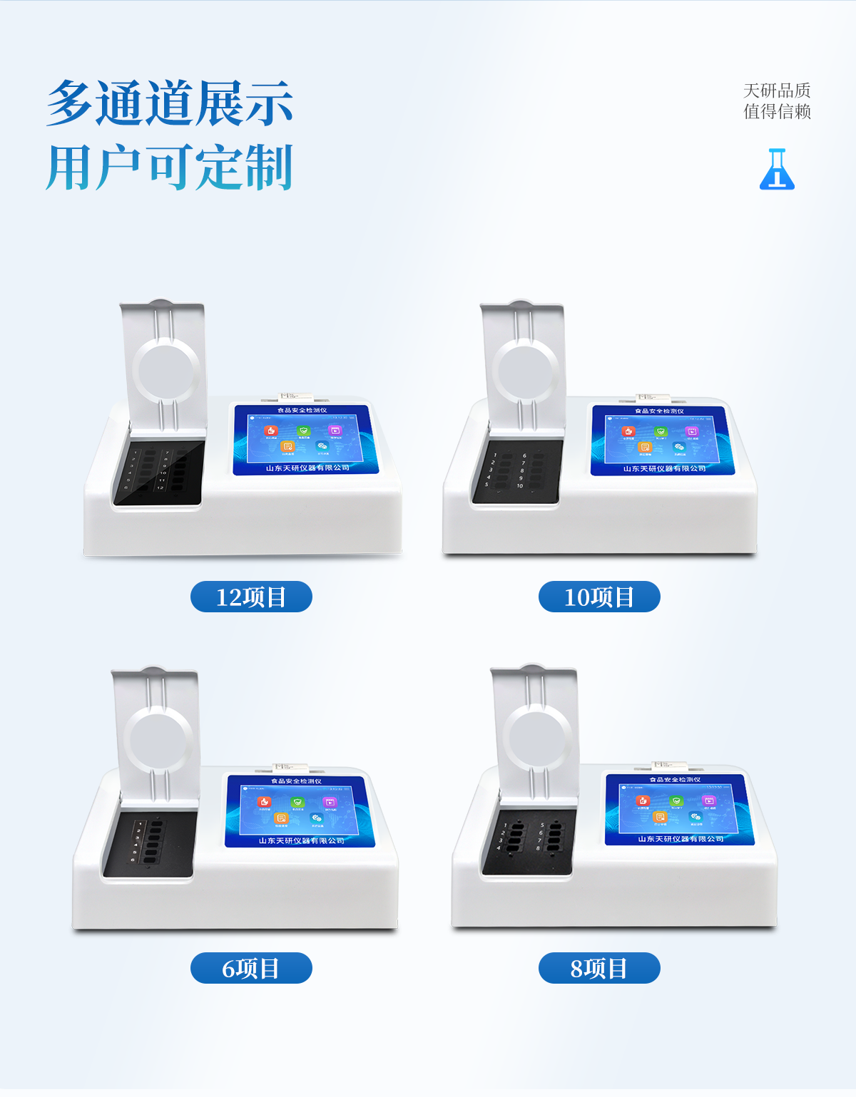 多功能食品安全檢測(cè)儀可快速檢測(cè)200多項(xiàng)目,包含非食用化學(xué)物質(zhì)、濫用食品添加劑、農(nóng)藥殘留、獸藥殘留、重金屬、病害肉、營(yíng)養(yǎng)強(qiáng)化劑、抗生素類殘留、激素類殘留、真菌毒素類殘留、化學(xué)類殘留等現(xiàn)場(chǎng)的定性定量檢測(cè)。該多功能食品安全檢測(cè)儀為集成化食品安全快速檢測(cè)分析設(shè)備,廣泛應(yīng)用于市場(chǎng)監(jiān)管局、檢測(cè)中心、衛(wèi)生監(jiān)督部門、農(nóng)業(yè)部門、院校及各單位食堂、食品肉產(chǎn)品深加工企業(yè)、商超市場(chǎng)、司法部門、餐飲機(jī)構(gòu)、養(yǎng)殖場(chǎng)、屠宰場(chǎng)、檢驗(yàn)檢疫部門等單位使用。