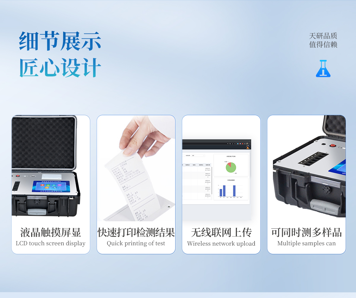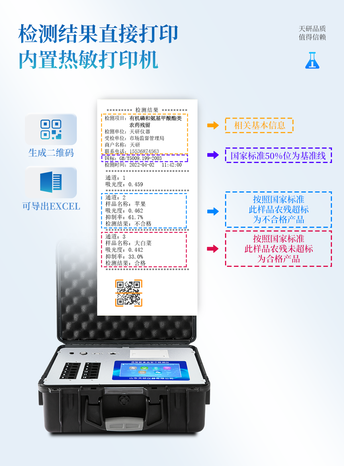 | 安卓智能操作系統(tǒng),采用更加**的UI交互界面,儀器具有wifi聯(lián)網(wǎng)上傳、4G聯(lián)網(wǎng)傳輸、GPRS無(wú)線遠(yuǎn)傳、網(wǎng)線連接功能,快速批量上傳數(shù)據(jù)。 | 智能化程度高,儀器具有自檢功能:具有開機(jī)自檢和調(diào)零功能,具有自動(dòng)檢測(cè)重復(fù)性功能。 | 新一代高速熱敏打印機(jī),檢測(cè)完成可自動(dòng)打印或批量打印檢測(cè)報(bào)告和二維碼。 | 儀器帶有監(jiān)管平臺(tái),數(shù)據(jù)可局域網(wǎng)和互聯(lián)網(wǎng)數(shù)據(jù)上傳,檢測(cè)結(jié)果直接傳至食品安全監(jiān)管平臺(tái)。進(jìn)行區(qū)域食品安全監(jiān)管及大數(shù)據(jù)分析處理與數(shù)據(jù)統(tǒng)計(jì),檢測(cè)區(qū)域食品安全長(zhǎng)短期動(dòng)態(tài),達(dá)到食品安全問(wèn)題預(yù)估、預(yù)警 | 一體化主機(jī),包含食品安全檢測(cè)模塊、多通道農(nóng)藥殘留檢測(cè)模塊、膠體金免疫層析檢測(cè)模塊。 | 一體化便攜式快檢設(shè)備,滿足現(xiàn)場(chǎng)及流動(dòng)檢測(cè)使用需求,能夠在同一軟件下實(shí)現(xiàn)所有檢測(cè)項(xiàng)目的檢測(cè),并可通過(guò)同一窗口直觀顯示檢測(cè)結(jié)果。 | 膠體金模塊檢測(cè)方式:軌道式自動(dòng)傳輸掃描,檢測(cè)完成后自動(dòng)退出檢測(cè)卡。 | CT線自動(dòng)識(shí)別,無(wú)需手動(dòng)調(diào)整。 | 內(nèi)置強(qiáng)大的數(shù)據(jù)庫(kù),具有多品類多種類樣品菜單功能,可靈活選擇檢測(cè)樣品,不同的檢測(cè)通道可同時(shí)檢測(cè)不同的樣品項(xiàng)目。也可在儀器上直接編輯錄入樣品名稱、檢測(cè)指標(biāo)、送檢單位等信息并保存進(jìn)樣品數(shù)據(jù)庫(kù)。 | 產(chǎn)品內(nèi)置操作演示視頻,是您身邊的化驗(yàn)指導(dǎo)專家。 | 樣品處理簡(jiǎn)單省力,整體操作快速、安全、便捷。 | 儀器具有自身保護(hù)功能,可設(shè)置用戶名及密碼,防止非工作人員操作等。 | 高靈敏度,高檢測(cè)精度,高重復(fù)性精度,掃描式高精度光學(xué)傳感器。 | 結(jié)果判定線可修改,對(duì)照值標(biāo)定值可保存,斷電不丟失數(shù)據(jù)。 | 兼容市場(chǎng)上所有的膠體金卡,使用耗材不受限制,極大增強(qiáng)用戶使用體驗(yàn)。 | 儀器具有重新校準(zhǔn)、鎖定、恢復(fù)出廠設(shè)置功能。 |