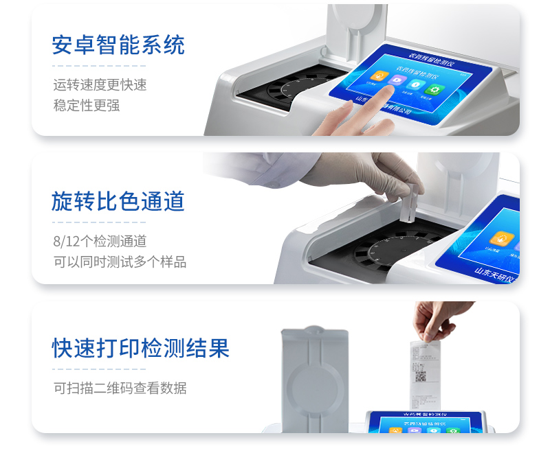 | 安卓智能操作系統(tǒng),采用更加**和人性化操作,儀器具有無線聯(lián)網(wǎng)上傳功能,快速上傳數(shù)據(jù),進(jìn)行數(shù)據(jù)統(tǒng)計(jì)和分析。 | 智能化程度高,儀器具有自檢功能:具有開機(jī)自檢和調(diào)零功能,具有自動(dòng)檢測(cè)重復(fù)性功能;同時(shí),檢測(cè)完成可自動(dòng)打印檢測(cè)報(bào)告和二維碼。手機(jī)掃碼可顯示出詳細(xì)檢測(cè)信息。 | 儀器帶有監(jiān)管平臺(tái),數(shù)據(jù)可局域網(wǎng)和互聯(lián)網(wǎng)數(shù)據(jù)上傳,檢測(cè)結(jié)果直接傳至食品安全監(jiān)管平臺(tái)。進(jìn)行區(qū)域食品安全監(jiān)管及大數(shù)據(jù)分析處理與數(shù)據(jù)統(tǒng)計(jì),檢測(cè)區(qū)域食品安全長(zhǎng)短期動(dòng)態(tài),達(dá)到食品安全問題預(yù)估、預(yù)警 。 | 樣品處理簡(jiǎn)單省力,整體操作快速、安全、便捷。 | 儀器具有自身保護(hù)功能,可設(shè)置用戶名及密碼,防止非工作人員操作等。 | 內(nèi)置強(qiáng)大的數(shù)據(jù)庫(kù),可在儀器上直接選擇樣品名稱、檢測(cè)指標(biāo)、送檢單位等信息,也可在儀器上直接編輯錄入樣品名稱、檢測(cè)指標(biāo)、送檢單位等信息并保存進(jìn)樣品數(shù)據(jù)庫(kù),方便后期操作調(diào)取使用。 | 儀器具有重新校準(zhǔn)、鎖定、恢復(fù)出廠設(shè)置功能。 |