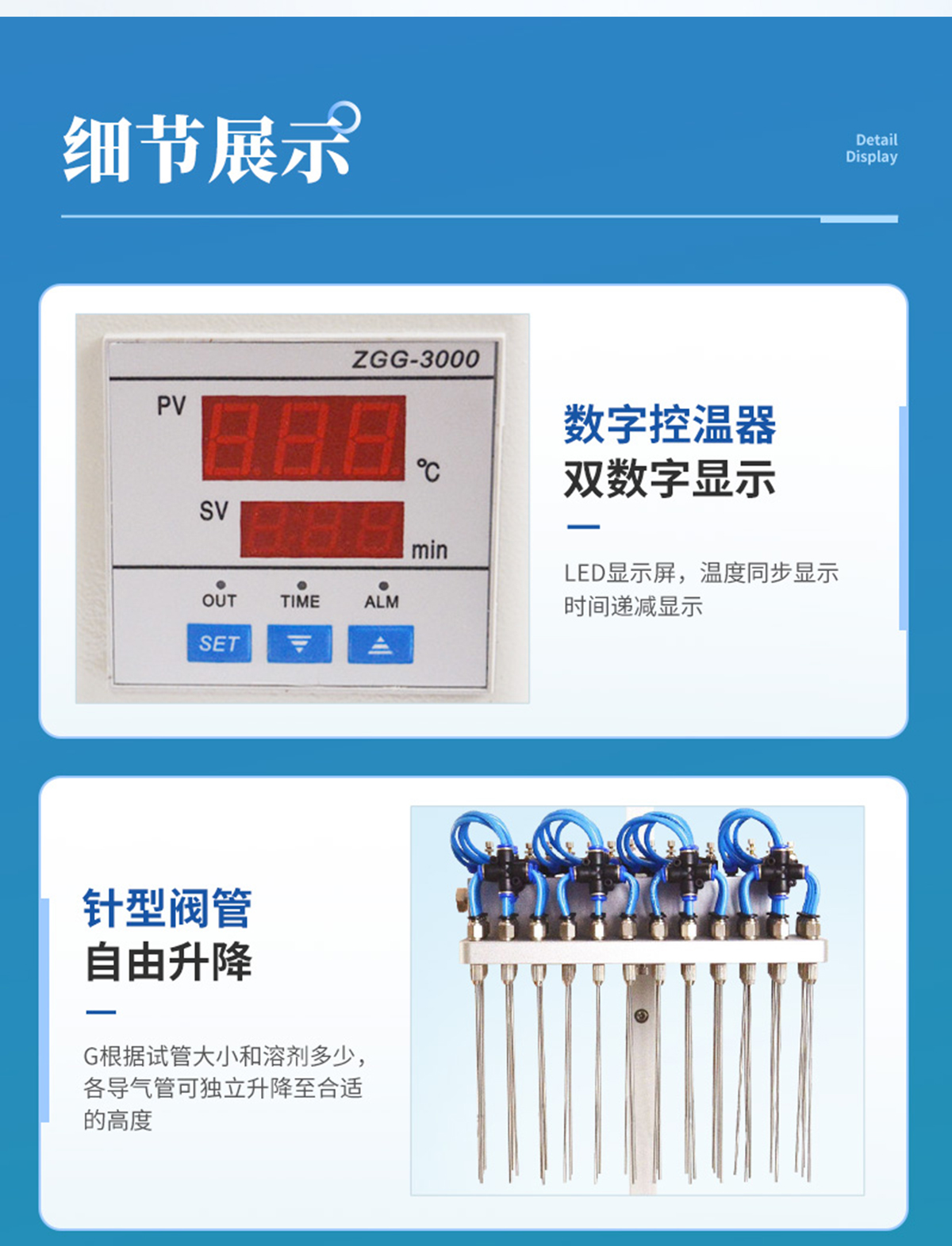 | 分配室上各氣針通道可組合使用或單獨(dú)使用,每一路氣針均可單獨(dú)開關(guān)。分配室的高度可視需要調(diào)節(jié)。 | 每一路氣體流量可單獨(dú)進(jìn)行調(diào)節(jié),克服了不可調(diào)氮吹儀各氣路氣流量大小不一的弱點(diǎn)。 | 數(shù)字溫控器,雙數(shù)字顯示. | 可能與溶劑接觸的部件均采用不銹鋼材料、合金鋁并表面進(jìn)行塑料噴涂,使用壽命長且清潔方便。 | 整機(jī)可放入通風(fēng)櫥中使用。 | 一般標(biāo)配的加熱塊規(guī)格為孔徑∮16mm。 |