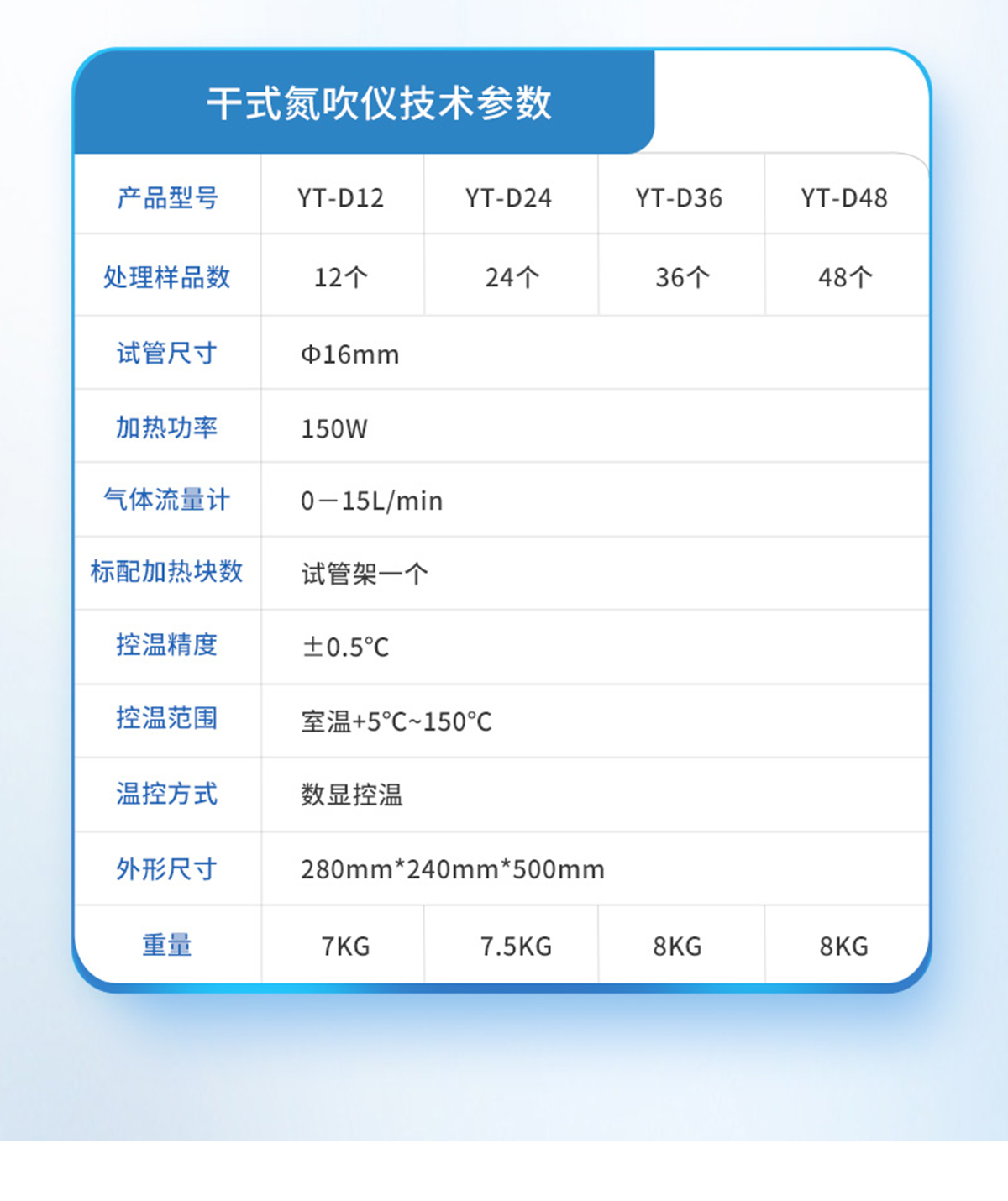 | YT-D24S | 24個 | Ф16mm | 330ml/min/樣品(可調(diào)節(jié)) | 0-15L/min | 試管架一個 | ±0.5℃ | 室溫---100℃ | 數(shù)顯控溫 | 340*200*460 | 600W | 7.5KG |