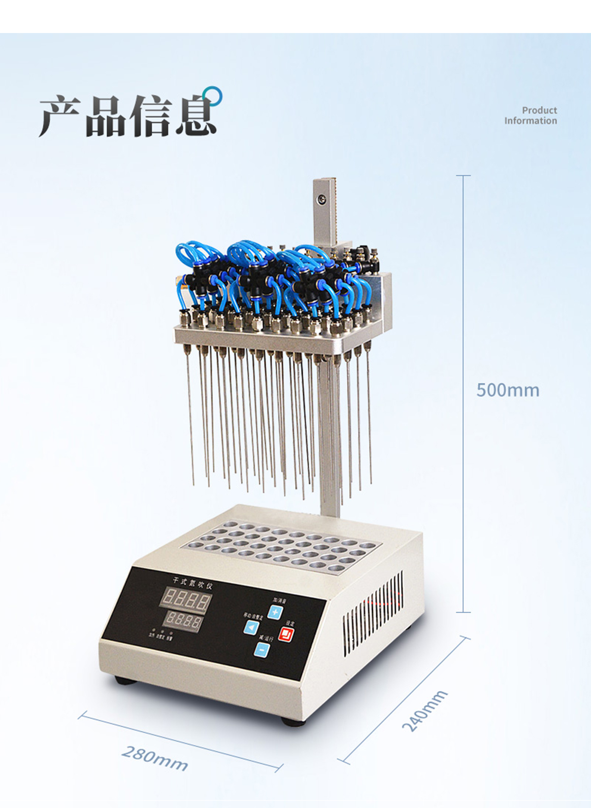 | 每個吹針都可以獨立控制,避免引起交叉污染。 | 儀器氣腔高度可以自行調(diào)節(jié),配備標準氣針長度為15厘米。 | 氮吹儀有36個氣道控制開關,節(jié)約氣體,每根吹氣針的位置可獨立改變吹掃位置,使之適用不同的樣品容器及不同的樣品位置 | 在濃縮有毒溶劑時,整個系統(tǒng)可置于通風柜中,降低危險。 | 內(nèi)置超溫保護裝置,自動故障檢測及報警功能,方便實用。 | 儀器有LED顯示屏,溫度同步顯示、時間遞減顯示,可時時觀察溫度變化。 | 具有整體溫度更均勻,加熱速度快 | 本產(chǎn)品還可以作為普通的干式恒溫器使用 | 使用起來更簡便,而且溫度也可以達到150℃,可以更好濃縮樣品 |