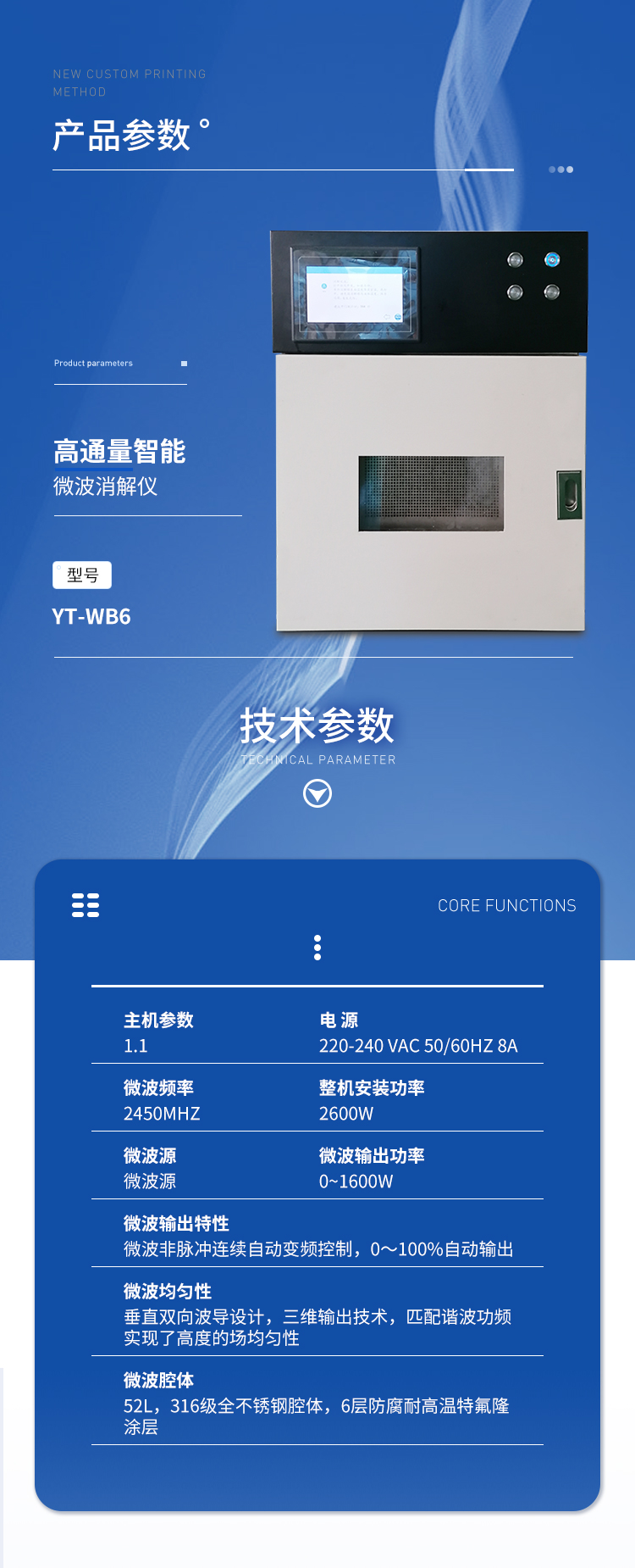 | 主機(jī)參數(shù);1.1電 源:220-240 VAC 50/60Hz 8A ; | 微波頻率:2450MHz; | 整機(jī)安裝功率:2600W; | (1)電源要求:220 VAC 50 Hz 15A; | (2)微波源: | (3)微波輸出功率 :0~1600W; | (4)微波輸出特性:微波非脈沖連續(xù)自動(dòng)變頻控制,0~100%自動(dòng)輸出; | (5)微波均勻性:垂直雙向波導(dǎo)設(shè)計(jì),三維輸出技術(shù),匹配諧波功頻實(shí)現(xiàn)了高度的場均勻性; | (6)微波腔體:52L,316級(jí)全不銹鋼腔體,6層防腐耐高溫特氟隆涂層; | (7)自鎖式緩沖防爆爐門,在危險(xiǎn)出現(xiàn)時(shí)能自動(dòng)提前釋放橫向壓力沖擊,確保操作人員人身安全和爐門結(jié)構(gòu) 完整無損; | (8)排風(fēng)和冷卻系統(tǒng):爐腔配備大功率排風(fēng)系統(tǒng),各種反應(yīng)可在通風(fēng),安全和易于觀察的環(huán)境下長時(shí)間連續(xù)進(jìn)行。爐腔通風(fēng)采用耐酸蝕,大風(fēng)量離心式風(fēng)機(jī),排風(fēng)量不小于5m3/min;爐腔內(nèi)具有風(fēng)冷功能,持續(xù)為反應(yīng)罐降溫,溫度和壓力實(shí)時(shí)顯示。 | (9)轉(zhuǎn)盤設(shè)計(jì):360°同向往返連續(xù)旋轉(zhuǎn),微波均勻,保證各個(gè)樣品微波環(huán)境相同,提高實(shí)驗(yàn)結(jié)果的一致性。 | (10)控制方式:觸摸屏設(shè)計(jì),8寸TFT-LED(800X480彩)大屏幕顯示,遠(yuǎn)距離直讀反應(yīng)進(jìn)程,實(shí)時(shí)顯示密閉反應(yīng)罐溫度、壓力,并可實(shí)時(shí)顯示溫壓曲線; | (11)操作語言:中文簡體 | (12)自動(dòng)保護(hù)功能:具有故障自檢系統(tǒng);當(dāng)控溫和控壓中某一系統(tǒng)失靈時(shí),儀器會(huì)自動(dòng)切斷微波發(fā)射,并且報(bào)警; |