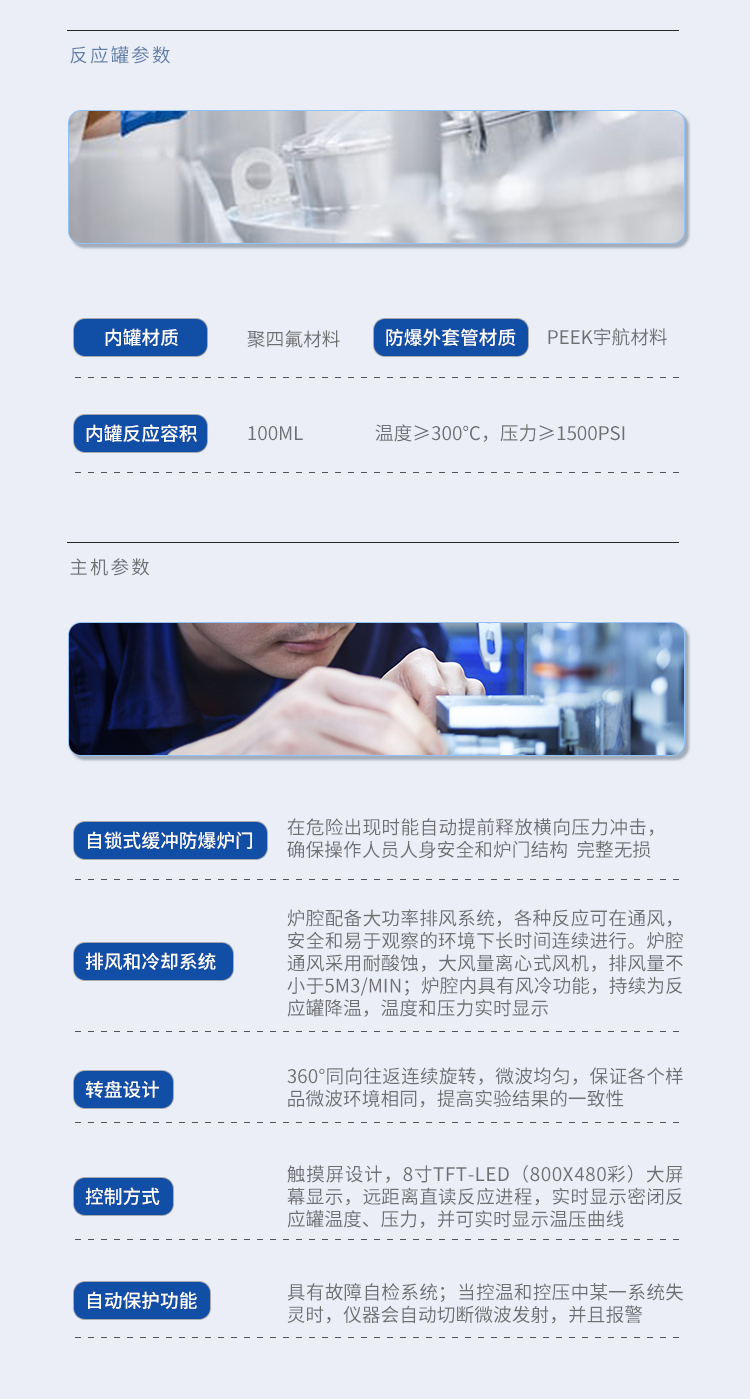 | (1)高溫度≥300℃,高壓力≥1500psi; | (2)內(nèi)罐材質(zhì):聚四氟材料; | (3)防爆外套管材質(zhì):PEEK宇航材料; | (4)內(nèi)罐反應(yīng)容積:100ml; | (5)高壓消解罐批處理量≥20個(gè)樣品/批(可不更換轉(zhuǎn)子升級(jí)為40位); | (6)防爆膜片采用陶瓷壓緊,陶瓷受熱不變形,四氟受熱變形,起不到防爆膜作用,采用陶瓷件壓緊。 | (7)消解罐工作方式為360°同向連續(xù)旋轉(zhuǎn),微波均勻,各個(gè)樣品微波環(huán)境相同,提高實(shí)驗(yàn)結(jié)果的一致性 |