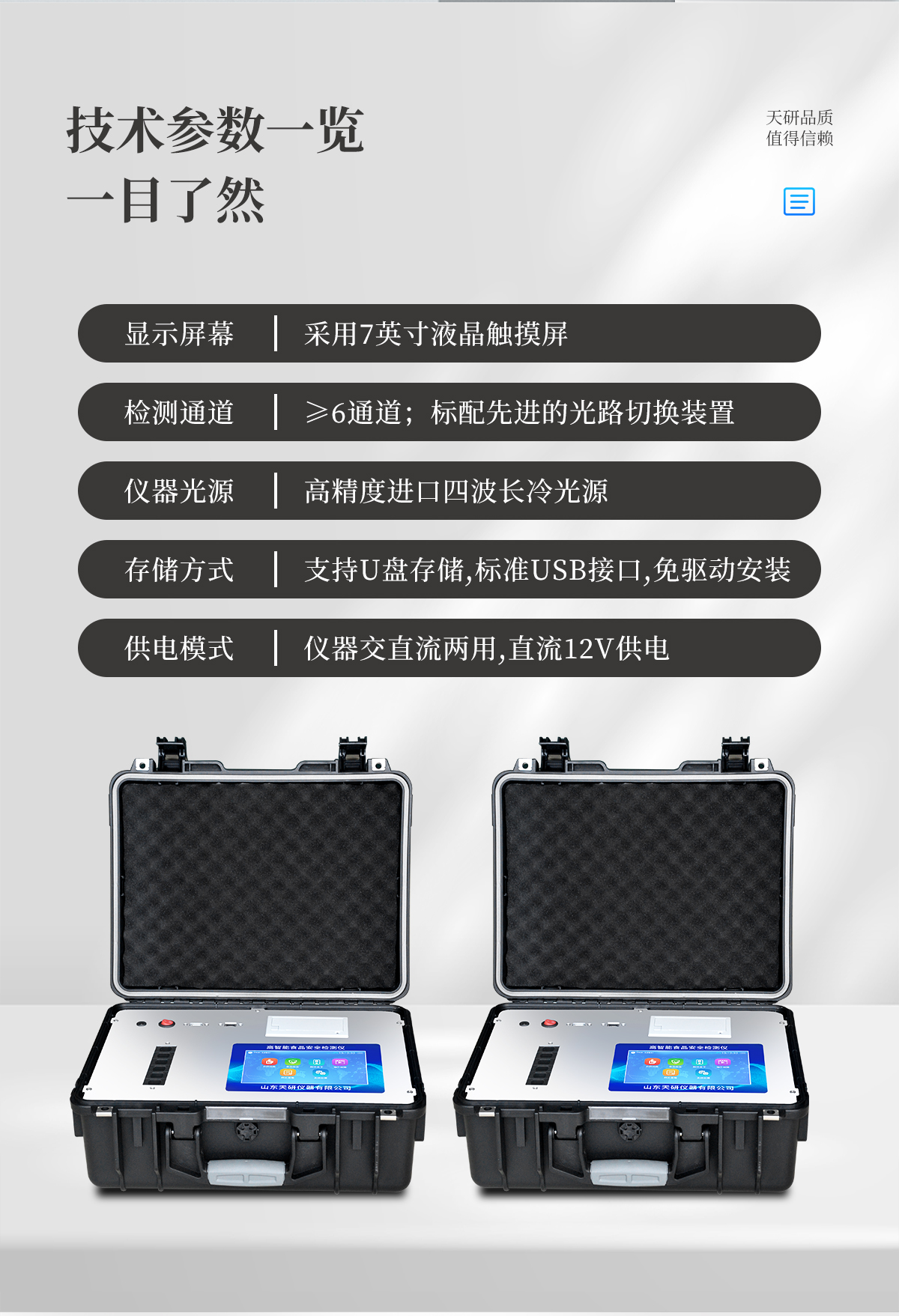 | 儀器采用手提式一體化系統(tǒng)檢測技術,將分光光度模塊、新型農(nóng)殘檢測模塊、數(shù)字化管理模塊、無線通訊模塊高度集成于一體,支持檢測200種食品安全檢測項目,同時預留升級檢測方法。 | 儀器檢測模塊標準化、智能化,檢測項目可隨意自由組合。檢測箱體內(nèi)置多個標準檢測單元,檢測模塊可以調(diào)整配置。 | 顯示屏幕:儀器采用10.1英寸豎向液晶觸摸屏顯,搭配運行安卓智能操作系統(tǒng),主控芯片采用ARM Cortex-A7,RK3288/4核處理器,主頻1.88Ghz,操作方便,性能更強。 | 檢測通道:≥12通道;采用精密旋轉(zhuǎn)比色池設計,使用同芯片同光源校準精度,解決不同光源之間的誤差值,更加準確**。(1-12通道間誤差0.1%,**號:ZL202022821055.2) | 儀器光源:高精度進口四波長冷光源,每個通道均配置 410、520、590、630nm 波長光源,標配**的光路切換裝置,**光路切換功能可實現(xiàn)64波長,并且所有檢測項目可實現(xiàn)所有通道同時檢測。 | 設備可一鍵校準,自動保存校準數(shù)據(jù),自動對比校驗,得到精準光源,采用Android SP存儲數(shù)據(jù),光源數(shù)據(jù)永不丟失,方便每一次使用。 | 通訊接口:配備無線通信模塊、4G(APN)通訊模塊、藍牙傳輸,同時具有雙USB接口以及RJ45網(wǎng)線接口,可以多方式實現(xiàn)數(shù)據(jù)保存及數(shù)據(jù)傳輸 | 存儲方式:支持U盤存儲,標準USB接口,免驅(qū)動安裝。檢測結(jié)果存儲容量20萬條以上,可生成Excel表格進行拷貝,并具有登錄保護功能。 | 智能化操作系統(tǒng): | 1)操作系統(tǒng):儀器可在同一檢測界面自動對應相關檢測通道,一次性選擇1-12個樣品名稱,無需退出界面,節(jié)省操作時間。并可以對每個通道屬性和樣品信息單獨進行編輯,例如送檢單位、人員,檢測人員等,打印時勾選打印顯示。 | 2)數(shù)據(jù)集成系統(tǒng):設備首頁自動匯總分析檢測數(shù)據(jù),包含:周檢測數(shù)據(jù)、月檢測數(shù)據(jù),全部檢測總數(shù)量,均包含檢測總數(shù),合格數(shù),不合格數(shù),以及相關柱形分析圖,各項檢測數(shù)據(jù)一目了然,無需電腦查詢,更加快捷直觀。 | 3)數(shù)據(jù)庫系統(tǒng):十幾項數(shù)據(jù)庫分類管理儀器:包含項目類型、項目數(shù)據(jù)、檢測數(shù)據(jù)、歷史記錄、國標信息、曲線信息、采樣信息、檢測信息、受檢信息、復核信息、圖表信息、光源校準信息、打印樣式信息、樣品庫信息等等,數(shù)據(jù)庫之間互相協(xié)調(diào)聯(lián)動保證數(shù)據(jù)的真實完整性。同時產(chǎn)品數(shù)據(jù)庫以及歷史檢測記錄支持一鍵檢索功能。 | 4)限量規(guī)判系統(tǒng):具有限量查詢、添加物質(zhì)合規(guī)判定系統(tǒng)。檢測出結(jié)果后,系統(tǒng)自動調(diào)用系統(tǒng)數(shù)據(jù)庫中相關國標進行比對判定,客觀顯示判定結(jié)果是否合格。 | 5)項目預設系統(tǒng):儀器具有任務預設模塊,一鍵提前預設,給出方便快捷的新檢測方案,每一個任務分別可以設置不同的樣品、批次、編號、來源、備注、抽樣信息、檢測信息、受檢信息、復核信息等更多信息。樣品送檢時一鍵調(diào)取保存信息,并可多次調(diào)取,大大提高檢測效率。 | 6)數(shù)據(jù)監(jiān)管系統(tǒng):同步對接監(jiān)管平臺,數(shù)據(jù)可局域網(wǎng)和互聯(lián)網(wǎng)數(shù)據(jù)上傳,檢測結(jié)果可選擇直接傳至食品安全監(jiān)管平臺。進行區(qū)域食品安全監(jiān)管及大數(shù)據(jù)分析處理與數(shù)據(jù)統(tǒng)計,檢測區(qū)域食品安全長短期動態(tài),達到食品安全問題預估、預警。 | 7)打印系統(tǒng):內(nèi)置全新打印機,新創(chuàng)自定義打印方式,可按需靈活勾選控制:產(chǎn)品合格證(國家農(nóng)業(yè)部標準要求),二維碼,抽樣信息、檢測信息,受檢信息、復核信息、抽樣日期、檢測日期等信息的打印。 | 供電模式:儀器交直流兩用,直流12V供電,可連接車載電源,可配6ah大容量充電鋰電池,電量可實時顯示,方便戶外流動測試。 | 膠體金檢測模塊:采用雙通道CMOS成像處理技術及膠體金免疫層析技術,可同時讀取雙膠體金卡數(shù)據(jù),自動采集、處理分析,將檢測結(jié)果顯示,并可根據(jù)參考限值自動判斷檢測結(jié)果,可檢測常見的獸藥殘留、生物毒素、抗生素、違禁添加物等。 | 1)探測技術:CMOS成像探測; | 2)檢測通道:1個通道; | 3)檢測方式:消線法和比色法; | 4)顯示模式:陰性或陽性; | 5)曲線形式:軌道式掃描方式,顯示金標卡圖像,實時生成、識別CT曲線圖,無需手動調(diào)整,完成檢測后自動退出檢測卡。兼容市場上其他金標卡,使用耗材不受限制。 | 儀器加入遠程升級功能,可定向分客戶分儀器更新,開機后自動更新,客戶無需任何操作,即可升級全新項目。做到了無需退換機器即可實現(xiàn)實時遠程升級檢測儀器。 |