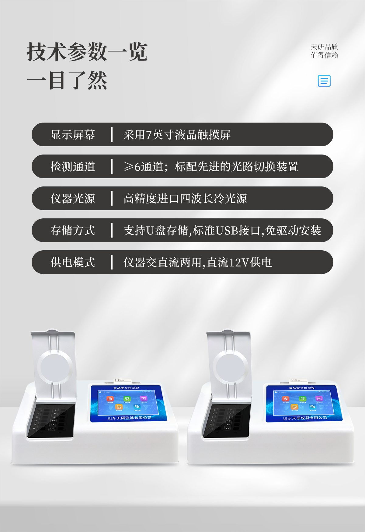 | 主控芯片采用ARM Cortex-A7,RK3288/4核處理器,主頻1.88Ghz,運(yùn)轉(zhuǎn)速度更快速,穩(wěn)定性更強(qiáng)。 | 顯示方式:7英寸液晶觸摸屏顯示,人性化中文操作界面,讀數(shù)直觀、簡(jiǎn)單。 | 交直流兩用,直流12V供電,也可連接車載電源,可加配6ah大容量充電鋰電池,方便戶外流動(dòng)測(cè)試。 | 四波長(zhǎng)冷光源,12個(gè)檢測(cè)通道,每個(gè)通道均配置410、520、590、630nm波長(zhǎng)光源,標(biāo)配**的光路切換裝置,專業(yè)光路切換功能可實(shí)現(xiàn)*多64波長(zhǎng),并且所有檢測(cè)項(xiàng)目可實(shí)現(xiàn)所有通道同時(shí)檢測(cè) | 光源亮度自動(dòng)調(diào)節(jié)與校準(zhǔn) | 智能恒流穩(wěn)壓,光強(qiáng)自動(dòng)校準(zhǔn),長(zhǎng)時(shí)間連續(xù)工作光源無(wú)溫漂現(xiàn)象。 | 內(nèi)置新國(guó)家限量標(biāo)準(zhǔn),與所測(cè)結(jié)果進(jìn)行現(xiàn)場(chǎng)比對(duì),并持續(xù)更新標(biāo)準(zhǔn)。 | 不間斷進(jìn)樣,連續(xù)檢測(cè) | 樣本編號(hào)自動(dòng)累加。 | 檢測(cè)結(jié)果為Excel表格,連接電腦即可拷貝。 | 檢測(cè)結(jié)果存儲(chǔ)容量20萬(wàn)條 | 支持U盤存儲(chǔ),標(biāo)準(zhǔn)USB接口,免驅(qū)動(dòng)安裝。 | 檢測(cè)項(xiàng)目可擴(kuò)充,固件可升級(jí) | 儀器尺寸:43×35×20cm, 主機(jī)凈重:5.2g |