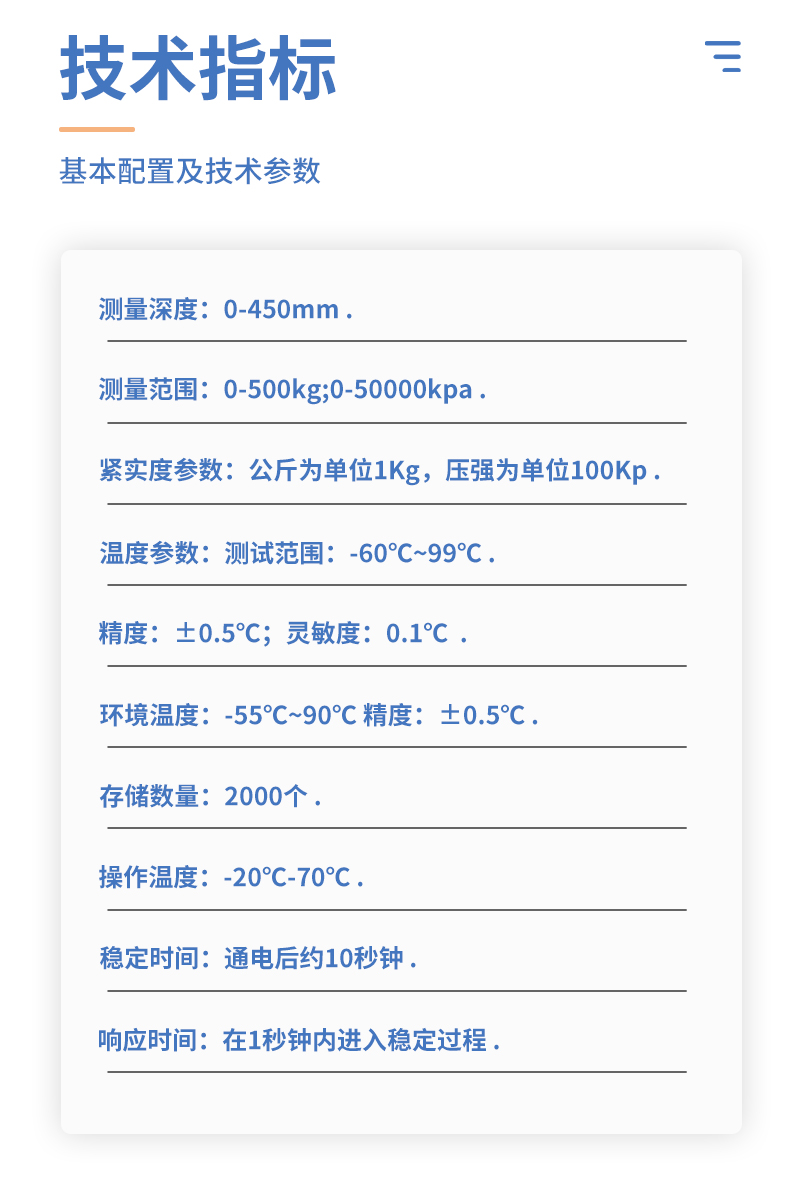 | 顯示屏:2.4英寸彩色TFT液晶 | 接口:電源接頭:5.5*2.5/2.1;USB接口:連接電腦;航空插頭:RS485 | 存儲(chǔ):大容量FLASH存儲(chǔ)器;可存儲(chǔ)10萬(wàn)條數(shù)據(jù);自動(dòng)存儲(chǔ):1S~180S可調(diào) | 定位:GPS | GSM上傳:GPRS/2G/4G | 電池:12V 2500mah鋰電池;工作時(shí)間:10H;充電時(shí)間:3H | 導(dǎo)出:USB線連接電腦上位機(jī),導(dǎo)出Excel表格 | 單位:kg/cm2;LB;N/cm2;Kpa | 土壤緊實(shí)度傳感器: | 量程:0~100kg | 靈敏度:2.0±0.1mv/V | 綜合精度:0.1%F?S | 重復(fù)性:±0.05%F?S | 工作溫度:-20~﹢70℃ | 探針材質(zhì):不銹鋼 | 輸入阻抗:735 ±35Ω | 輸出阻抗:700±3Ω | 非線性:±0.05 %F?S | 密封等級(jí):IP66 | 激勵(lì)電壓:5~12 VDC | 線纜:φ3×2000mm |