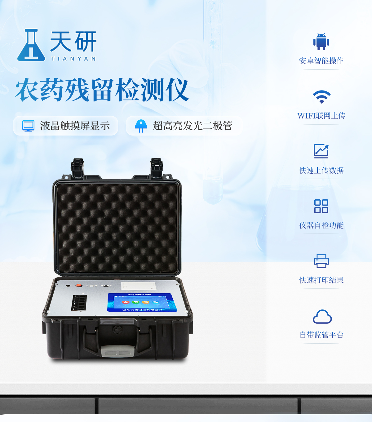 | 機(jī)箱采用工業(yè)級(jí)ABS工程塑料箱,方便攜帶,穩(wěn)固耐用,便于流動(dòng)測(cè)試。 | 智能操作系統(tǒng),采用更加人性化操作,主控采用多核處理器,主頻1.88Ghz,運(yùn)轉(zhuǎn)速度更快速,穩(wěn)定性更強(qiáng)。 | 自動(dòng)判斷樣品是否合格,檢測(cè)結(jié)果更加直觀。 | 儀器具有100多種蔬菜名稱菜單庫,分類管理,并可按需添加或刪除蔬菜名,編輯蔬菜名稱,可直接打印出蔬菜名稱。 | 檢測(cè)通道:18個(gè)檢測(cè)通道,可以同時(shí)測(cè)試多個(gè)樣品,循環(huán)檢測(cè),即放即檢,每個(gè)樣品由程序控制分別獨(dú)立工作,不會(huì)互相干擾。 | 儀器具有wifi聯(lián)網(wǎng)功能,可將數(shù)據(jù)快速上傳電腦,進(jìn)行數(shù)據(jù)管理與統(tǒng)計(jì),4G信號(hào)GPRS遠(yuǎn)傳功能,可插手機(jī)卡實(shí)現(xiàn)數(shù)據(jù)遠(yuǎn)傳平臺(tái),。 | 顯示方式:7英寸高靈敏真彩觸摸屏顯示,人性化中文操作界面,讀數(shù)直觀、簡(jiǎn)單。 | 打印機(jī)采用串口5v打印,可選擇手動(dòng)打印或者自動(dòng)打印,三分鐘出打印結(jié)果,打印格式為檢測(cè)人姓名、吸光度差值、檢測(cè)時(shí)間、檢測(cè)機(jī)構(gòu)、樣品名稱及結(jié)果判定。 | 光源采用進(jìn)口超高亮發(fā)光二極管,具有低功耗、高精度、穩(wěn)定性強(qiáng)、光源可控可以關(guān)掉不使用的光源,響應(yīng)速度快等優(yōu)點(diǎn)。 | 智能恒流穩(wěn)壓,光強(qiáng)自動(dòng)校準(zhǔn),長(zhǎng)時(shí)間連續(xù)工作光源無溫漂現(xiàn)象。 | 采用USB2.0接口設(shè)計(jì),方便數(shù)據(jù)的存貯和移動(dòng),并可隨時(shí)與計(jì)算機(jī)直接相連,并且可用計(jì)算機(jī)控制儀器。實(shí)現(xiàn)數(shù)據(jù)查詢、瀏覽、分析、統(tǒng)計(jì)、打印等。 | 智能化程度高,儀器具有自檢功能:具有開機(jī)自檢和調(diào)零功能,具有自動(dòng)檢測(cè)重復(fù)性功能 | 儀器具有自身保護(hù)功能,可設(shè)置用戶名及密碼,防止非工作人員操作等。 | 采用DC12v直流供電,安全系統(tǒng)更高,并且配備6A鋰電池充電器。 | 儀器具有重新校準(zhǔn)、鎖定、恢復(fù)出廠設(shè)置功能。 |