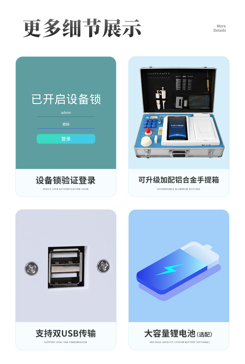 | 儀器采用臺式一體化系統(tǒng)檢測技術(shù),將分光光度模塊、新型農(nóng)殘檢測模塊、數(shù)字化管理模塊、無線通訊模塊高度集成于一體,支持檢測200種食品安全檢測項(xiàng)目,同時預(yù)留升級檢測方法。 | 儀器檢測模塊標(biāo)準(zhǔn)化、智能化,可隨意自由組合。檢測箱體內(nèi)置多個標(biāo)準(zhǔn)檢測單元,檢測模塊可以調(diào)整配置。 | 儀器采用全新安卓智能系統(tǒng),主控芯片采用 ARM Cortex-A7,RK3288/4核處理器,10.1寸高清液晶觸摸豎屏,更加**的UI交互界面,運(yùn)轉(zhuǎn)快捷;儀器配備無線通信模塊: 4G(APN)通訊模塊、Wifi模塊,藍(lán)牙傳輸,同時具有雙USB接口以及RJ45接口能以多種方式實(shí)現(xiàn)數(shù)據(jù)保存和數(shù)據(jù)傳輸功能。 | 創(chuàng)新檢測模式: | ★檢測通道:≥12通道;采用精密旋轉(zhuǎn)比色池設(shè)計(jì),使用同芯片同光源校準(zhǔn)精度,解決不同光源之間的誤差值。1-12通道間誤差0.1%。(**號:ZL202022821055.2) | ★儀器具有自動識別比色皿檢測功能,即:將樣品比色皿放入儀器后,點(diǎn)擊樣品檢測,儀器自動識別比色皿進(jìn)行通道檢測。 | 進(jìn)口高精光源: | 高精度進(jìn)口四波長冷光源,通道配置 410、520、590、630nm 波長光源,一個光源芯片驅(qū)動一個光源,誤差極小,每臺設(shè)備單獨(dú)**校準(zhǔn)光源,**比對,同時參照四種不同波段光源全方位覆蓋市面上99%的農(nóng)殘食品項(xiàng)目檢測。 | 智能化操作系統(tǒng): | 便捷操作系統(tǒng):設(shè)備檢測時可在同一檢測界面自動對應(yīng)相關(guān)檢測通道一次性選擇1-12個樣品名稱,無須退出界面,節(jié)省操作時間。 | 數(shù)據(jù)集成系統(tǒng):設(shè)備首頁自動統(tǒng)計(jì)檢測數(shù)據(jù)包含:周檢測數(shù)據(jù)、月檢測數(shù)據(jù),全部檢測總數(shù)量,均包含檢測總數(shù),合格數(shù),不合格數(shù),以及相關(guān)柱形分析圖,對各項(xiàng)檢測數(shù)據(jù)清晰掌握,無需電腦查詢,更加快捷直觀。 | 項(xiàng)目預(yù)設(shè)系統(tǒng):支持添加單個及多個相同或不相同的任務(wù)預(yù)設(shè),一鍵快速調(diào)取,每一個任務(wù)分別可以設(shè)置不同的樣品、批次、編號、來源、備注、抽樣信息、檢測信息、受檢信息、復(fù)核信息等更多信息。無縫鏈接平臺和APP實(shí)時查看下發(fā)任務(wù)。 | 數(shù)據(jù)監(jiān)管系統(tǒng):同步對接監(jiān)管平臺,數(shù)據(jù)可局域網(wǎng)和互聯(lián)網(wǎng)數(shù)據(jù)上傳,檢測結(jié)果可選擇直接傳至食品安全監(jiān)管平臺。集成OSS輸出存儲服務(wù)、區(qū)分設(shè)備定向管理應(yīng)用,進(jìn)行區(qū)域食品安全監(jiān)管及大數(shù)據(jù)分析處理與數(shù)據(jù)統(tǒng)計(jì),檢測區(qū)域食品安全長短期動態(tài),達(dá)到食品安全問題預(yù)估、預(yù)警。 | 自定義打印系統(tǒng):內(nèi)置全新打印系統(tǒng),新創(chuàng)自定義打印方式,可按需靈活設(shè)置開啟或關(guān)閉:產(chǎn)品合格證(國家農(nóng)業(yè)部標(biāo)準(zhǔn)要求),二維碼,抽樣信息、檢測信息,受檢信息、復(fù)核信息、抽樣日期、檢測日期等信息的打印。 | 系統(tǒng)遠(yuǎn)程更新功能:可定向分客戶分儀器更新系統(tǒng),按照不同客戶后期實(shí)際需求添加項(xiàng)目,無需機(jī)器返廠,即可遠(yuǎn)程實(shí)時升級全新系統(tǒng),節(jié)省時間成本及避免運(yùn)輸造成設(shè)備損壞。 | 儀器主機(jī)采用一體化防水、抗壓、防撞擊、防腐蝕箱體設(shè)計(jì),同時配備交直流供電,可連接車載電源,可選配大容量充電鋰電池,滿足現(xiàn)場野外檢測需求。 | 安全證書,放心保障:儀器具有中國計(jì)量科學(xué)研究院校準(zhǔn)證書,**認(rèn)證。 |