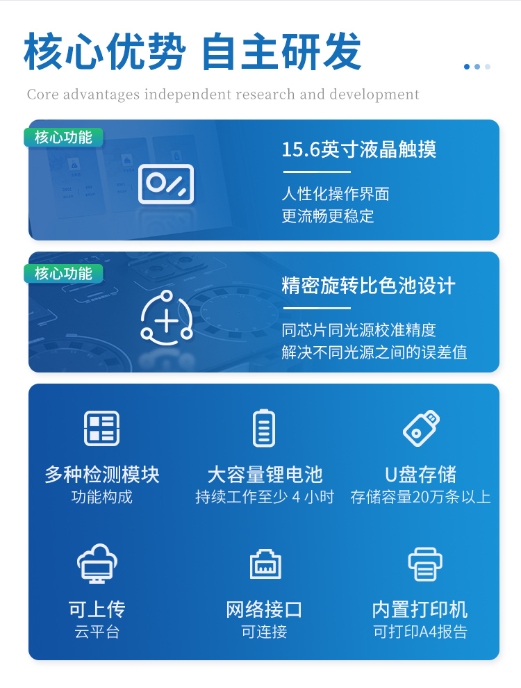 | 儀器采用臺式一體化系統(tǒng)檢測技術(shù),將分光光度模塊、膠體金檢測模塊、新型農(nóng)殘檢測模塊、數(shù)字化管理模塊、無線通訊模塊高度集成于一體,支持檢測200種食品安全檢測項目,同時預(yù)留升級檢測方法。 | 儀器檢測模塊標(biāo)準(zhǔn)化、智能化,檢測項目可隨意自由組合。檢測箱體內(nèi)置多個標(biāo)準(zhǔn)檢測單元,檢測模塊可以調(diào)整配置。 | 顯示屏幕:儀器采用10.1英寸豎向液晶觸摸屏顯,搭配運行安卓智能操作系統(tǒng),主控芯片采用ARM Cortex-A7,RK3288/4核處理器,主頻1.88Ghz,操作方便,性能更強。 | 檢測通道:≥12通道;采用精密旋轉(zhuǎn)比色池設(shè)計,使用同芯片同光源校準(zhǔn)精度,解決不同光源之間的誤差值,更加準(zhǔn)確**。(1-12通道間誤差0.1%,**號:ZL202022821055.2) | 儀器光源:高精度進口四波長冷光源,每個通道均配置 410、520、590、630nm 波長光源,標(biāo)配**的光路切換裝置,**光路切換功能可實現(xiàn)64波長,并且所有檢測項目可實現(xiàn)所有通道同時檢測。 | 設(shè)備可一鍵校準(zhǔn),自動保存校準(zhǔn)數(shù)據(jù),自動對比校驗,得到精準(zhǔn)光源,采用Android SP存儲數(shù)據(jù),光源數(shù)據(jù)永不丟失,方便每一次使用。 | 通訊接口:配備無線通信模塊、可選配4G(APN)通訊模塊和藍牙傳輸,同時具有雙USB接口以及RJ45網(wǎng)線接口,可以多方式實現(xiàn)數(shù)據(jù)保存及數(shù)據(jù)傳輸。 | 存儲方式:支持U盤存儲,標(biāo)準(zhǔn)USB接口,免驅(qū)動安裝。檢測結(jié)果存儲容量20萬條以上,可生成Excel表格進行拷貝,并具有登錄保護功能。 | 智能化操作系統(tǒng): | 1、操作系統(tǒng):儀器可在同一檢測界面自動對應(yīng)相關(guān)檢測通道,一次性選擇1-12個樣品名稱,無需退出界面,節(jié)省操作時間。并可以對每個通道屬性和樣品信息單獨進行編輯,例如送檢單位、人員,檢測人員等,打印時勾選打印顯示。 | 2、數(shù)據(jù)集成系統(tǒng):設(shè)備首頁自動匯總分析檢測數(shù)據(jù),包含:周檢測數(shù)據(jù)、月檢測數(shù)據(jù),全部檢測總數(shù)量,均包含檢測總數(shù),合格數(shù),不合格數(shù),以及相關(guān)柱形分析圖,各項檢測數(shù)據(jù)一目了然,無需電腦查詢,更加快捷直觀。 | 3、數(shù)據(jù)庫系統(tǒng):十幾項數(shù)據(jù)庫分類管理儀器:包含項目類型、項目數(shù)據(jù)、檢測數(shù)據(jù)、歷史記錄、國標(biāo)信息、曲線信息、采樣信息、檢測信息、受檢信息、復(fù)核信息、圖表信息、光源校準(zhǔn)信息、打印樣式信息、樣品庫信息等等,數(shù)據(jù)庫之間互相協(xié)調(diào)聯(lián)動保證數(shù)據(jù)的真實完整性。同時產(chǎn)品數(shù)據(jù)庫以及歷史檢測記錄支持一鍵檢索功能。 | 4、限量規(guī)判系統(tǒng):具有限量查詢、添加物質(zhì)合規(guī)判定系統(tǒng)。檢測出結(jié)果后,系統(tǒng)自動調(diào)用系統(tǒng)數(shù)據(jù)庫中相關(guān)國標(biāo)進行比對判定,客觀顯示判定結(jié)果是否合格。 | 5、項目預(yù)設(shè)系統(tǒng):儀器具有任務(wù)預(yù)設(shè)模塊,一鍵提前預(yù)設(shè),給出方便快捷的新檢測方案,每一個任務(wù)分別可以設(shè)置不同的樣品、批次、編號、來源、備注、抽樣信息、檢測信息、受檢信息、復(fù)核信息等更多信息。樣品送檢時一鍵調(diào)取保存信息,并可多次調(diào)取,大大提高檢測效率。 | 6、數(shù)據(jù)監(jiān)管系統(tǒng):同步對接監(jiān)管平臺,數(shù)據(jù)可局域網(wǎng)和互聯(lián)網(wǎng)數(shù)據(jù)上傳,檢測結(jié)果可選擇直接傳至食品安全監(jiān)管平臺。進行區(qū)域食品安全監(jiān)管及大數(shù)據(jù)分析處理與數(shù)據(jù)統(tǒng)計,檢測區(qū)域食品安全長短期動態(tài),達到食品安全問題預(yù)估、預(yù)警。 | 7、全新打印系統(tǒng):內(nèi)置全新打印機,新創(chuàng)自定義打印方式,可按需靈活勾選控制:產(chǎn)品合格證(國家農(nóng)業(yè)部標(biāo)準(zhǔn)要求),二維碼,抽樣信息、檢測信息,受檢信息、復(fù)核信息、抽樣日期、檢測日期等信息的打印。 | 8、A4紙版本報告打印功能(可選配):設(shè)備擁有兩種結(jié)果展示方式,可以自動生成A4打印模板和小票打印模板兩種樣式,可通過WiFi及網(wǎng)線等方式鏈接外置打印機可進行打印。 | 10、供電模式:儀器交直流兩用,直流12V供電,可連接車載電源,可配6ah大容量充電鋰電池,電量可實時顯示,方便戶外流動測試。 | 11、膠體金檢測模塊:采用單通道CMOS成像處理技術(shù)及膠體金免疫層析技術(shù),可讀取膠體金卡數(shù)據(jù),自動采集、處理分析,將檢測結(jié)果顯示,并可根據(jù)參考限值自動判斷檢測結(jié)果,可檢測常見的獸藥殘留、生物毒素、抗生素、違禁添加物等。 | 11.1、探測技術(shù):CMOS成像探測; | 11.2、檢測通道:1個通道; | 11.3、檢測方式:消線法和比色法; | 11.4、顯示模式:陰性或陽性; | 11.5、曲線形式:直插式掃描方式,顯示金標(biāo)卡圖像,實時生成、識別CT曲線圖,無需手動調(diào)整,完成檢測后自動退出檢測卡。兼容市場上其他金標(biāo)卡,使用耗材不受限制。 | 12、儀器具備遠程升級功能,可定向分客戶分儀器更新,開機后自動更新,并可持續(xù)性免費更新系統(tǒng)版本,無需像傳統(tǒng)產(chǎn)品返廠更新,節(jié)省時間及人力成