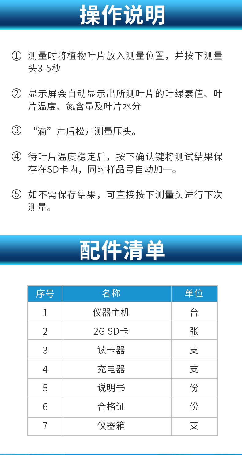 | 測(cè)量對(duì)象:陸地植物葉片 | 測(cè)量原理: 650nm和940nm兩種波長(zhǎng)下光密度差 | 測(cè)量范圍 0.0-99.9 SPAD | 測(cè)量面積 2mm*3mm | 測(cè)量精度 ±1.0 SPAD單位以內(nèi) (室溫下,SPAD值介乎0-50) | 重復(fù)性 ±0.3 SPAD單位以內(nèi) (SPAD值介乎0-50,保持測(cè)量位置不變) | 測(cè)量時(shí)間間隔 小于2秒 | 測(cè)量面積:2mm*2mm | 測(cè)量時(shí)間間隔:小于3秒 | 內(nèi)存 內(nèi)存16GB,可計(jì)算/顯示平均值,以及刪除異常值 | 樣品厚度** 1 mm | 樣品插入深度 10 mm | 電源 4.2V可充電鋰電池 | 電池容量 2000mah | 重量 250g | 外形尺寸 140×85×45mm(長(zhǎng)×寬×高) | 操作溫度/濕度范圍:0 - 50°C,相對(duì)濕度85% | 儲(chǔ)存溫度/濕度范圍:20 - 55°C,相對(duì)濕度85% | 標(biāo)準(zhǔn)配置:主機(jī), 充電器,USB數(shù)據(jù)線,便攜鋁箱,說(shuō)明書等 |