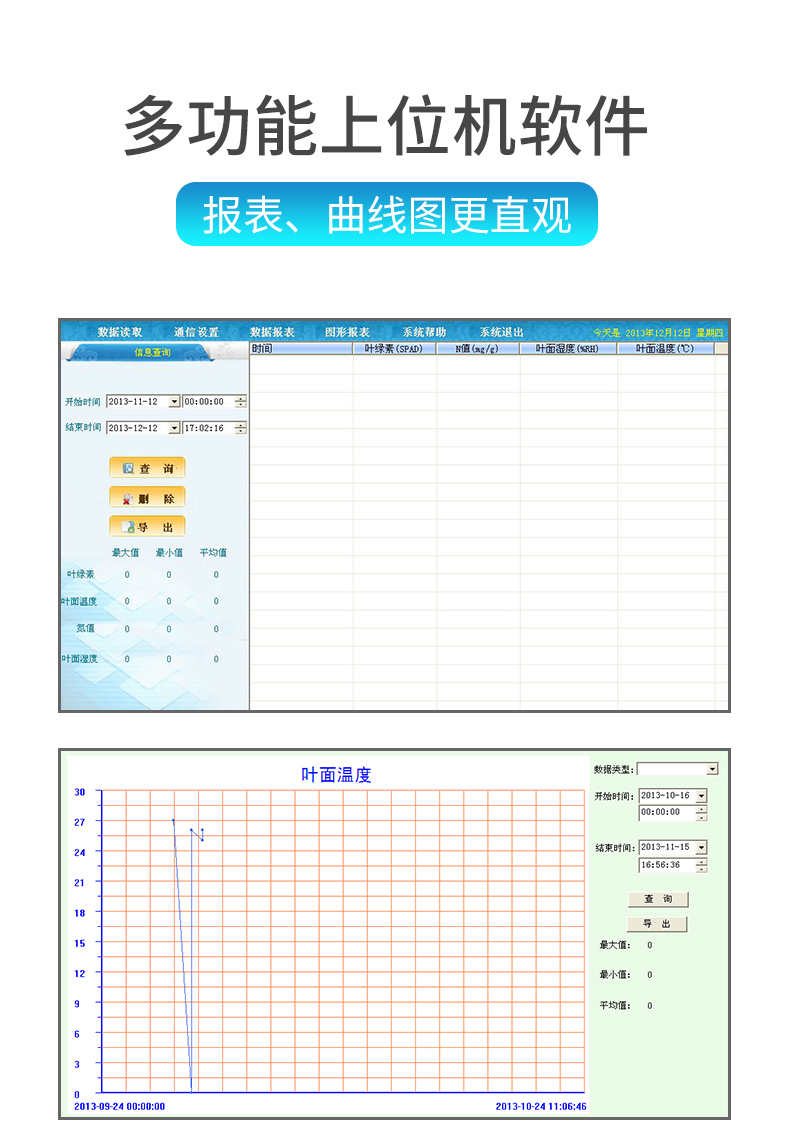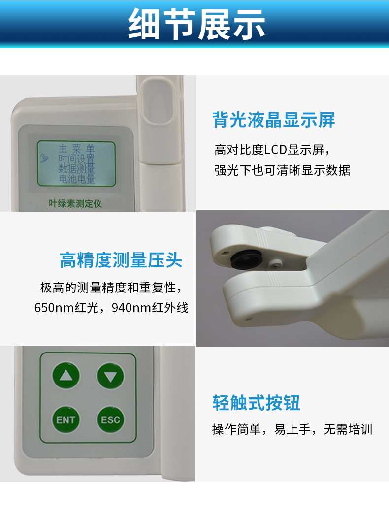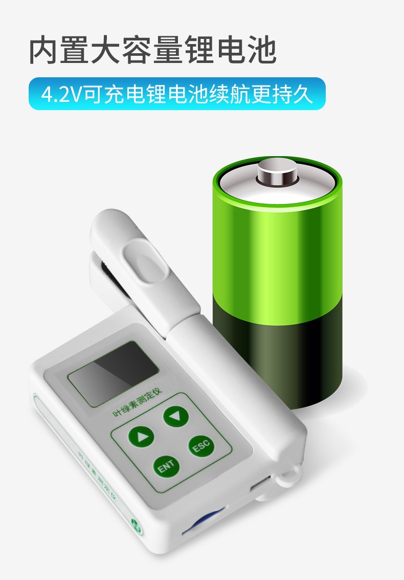 | 數(shù)據(jù)測(cè)量:**的測(cè)量精度和重復(fù)性(精度:± 1.0 SPAD,重復(fù)性:±0.3 SPAD) ,媲美進(jìn)口品牌,或可根據(jù)已知葉綠素含量的葉片或標(biāo)準(zhǔn)試樣客戶自行校準(zhǔn) | 數(shù)據(jù)分組:儀器可將數(shù)據(jù)自動(dòng)分組,并可自動(dòng)計(jì)算每組數(shù)據(jù)的平均值??蓪⑼蝗~片測(cè)量的數(shù)據(jù)自動(dòng)分為一組,便于查看每次測(cè)量數(shù)據(jù)及這一組數(shù)據(jù)的平均值,有效的避免了不同葉片的測(cè)量數(shù)據(jù)混淆。采用16GB超大存儲(chǔ),所以分組數(shù)量和每組的數(shù)據(jù)不受限制 | 數(shù)據(jù)存儲(chǔ): 16GB超大存儲(chǔ)空間,數(shù)據(jù)存儲(chǔ)量巨大 | 數(shù)據(jù)瀏覽:可在儀器上隨時(shí)瀏覽測(cè)量的數(shù)據(jù)、每組數(shù)據(jù)的平均值和刪除異常數(shù)值。數(shù)據(jù)情況更加直觀 | 數(shù)據(jù)導(dǎo)出:多功能USB接口,可實(shí)現(xiàn)數(shù)據(jù)導(dǎo)出與充電功能,可將儀器與電腦直接聯(lián)機(jī),數(shù)據(jù)以EXCEL格式導(dǎo)出,無(wú)需上位機(jī)軟件,操作簡(jiǎn)單方便 | 顯示:高對(duì)比度LCD顯示屏,強(qiáng)光下也可清晰顯示數(shù)據(jù) | 測(cè)量迅速、簡(jiǎn)便:測(cè)量時(shí)只需要將葉片插入并合上測(cè)量探頭即可,不需要采摘葉片,不影響作物正常生長(zhǎng),可以在作物的生長(zhǎng)過(guò)程中全程對(duì)特定的葉片進(jìn)行監(jiān)測(cè),從而得到更科學(xué)的分析結(jié)果 | 電池消耗:低功耗模式設(shè)計(jì),內(nèi)置大容量鋰離子充電電池,節(jié)能環(huán)保并方便進(jìn)行戶外操作 | 儀器充電:**的充電管理設(shè)計(jì),可適配多數(shù)的USB口(5V)充電器,具有防過(guò)充功能 | 易攜帶:250g的重量,方便攜帶到田間進(jìn)行活體測(cè)量 |