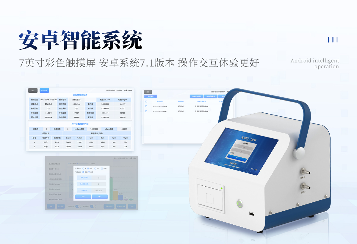 | 1、安卓系統(tǒng)7.1版本,操作交互體驗更好。 | 2、內(nèi)置溫濕度傳感器、環(huán)境氣壓傳感器 | 3、核心部件光散射傳感器明顯消除腔體的雜散光,信噪比大為提高。從而使測量更準確更可靠。 | 4、按95%置信度(UCL)計算,計數(shù)結(jié)果可換算成m3和ft3 | 5、依照凈化級別劃分和規(guī)定,自動判定凈化級別,使用便利。 | 6、帶審計追蹤功能,可查詢、可追溯、可控制,符合FDA 21CFR PART11規(guī)范 | 7、支持wifi、藍牙傳輸,數(shù)據(jù)可無線上傳;同時支持U盤拷貝數(shù)據(jù),免驅(qū)動插拔。 | 8、配置監(jiān)管平臺,檢測結(jié)果可直接無線傳至平臺,進行潔凈度長短期分析,輔助管理。 | 9、內(nèi)置新一代高速熱敏打印機,可選擇所需要打印的粒徑通道,靈活打印結(jié)果。 | 10、交直流兩用,內(nèi)置充電鋰電池,環(huán)保耐用可支持連續(xù)采樣6小時以上。 | 11、便捷簡易伸縮式云臺支架,安裝采樣操作更加方便。 |
