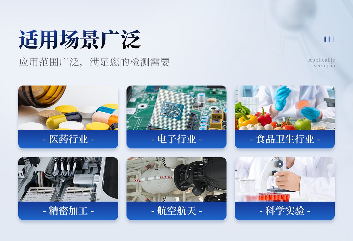 滿足醫(yī)藥行業(yè)(制藥廠、藥檢所、醫(yī)院手術(shù)室等);電子行業(yè)(半導體工廠、精密機械的生產(chǎn)加工等);食品衛(wèi)生行業(yè)(乳制品、塑封肉食品、調(diào)味食品、農(nóng)產(chǎn)品等的精加工);過濾器的生產(chǎn)廠家,檢驗過濾器的質(zhì)量及效率等;光學、及航空航天等領(lǐng)域的精加工、精密試驗所需的潔凈室(區(qū))的檢測需要。