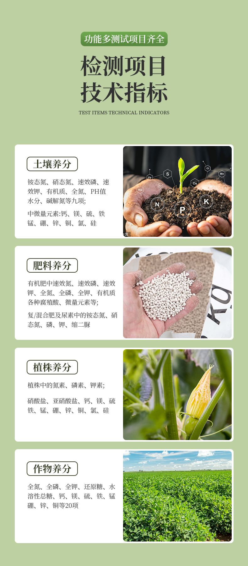 | 土壤養(yǎng)分:●銨態(tài)氮、硝態(tài)氮、速效磷、速效鉀、有機質(zhì)、全氮、堿解氮、pH值、含鹽量、水分等十項; ● 中微量元素:鈣、鎂、硫、鐵、錳、硼、鋅、銅、氯、硅等。 | 肥料養(yǎng)分:● 單質(zhì)化肥中的氮、磷、鉀; ● 復(fù)(混)合肥及尿素中的銨態(tài)氮、硝態(tài)氮、磷、鉀、縮二脲; ● 有機肥中速效氮、速效磷、速效鉀、全氮、全磷、全鉀、有機質(zhì),各種腐植酸、微量元素(鈣、鎂、硫、鐵、錳、硼、鋅、銅、氯、硅)等。 | 植株養(yǎng)分:● 植株中的氮素、磷素、鉀素;硝酸鹽、亞硝酸鹽;鈣、鎂、硫、鐵、錳、硼、鋅、銅、氯、硅等項。 | 煙葉養(yǎng)分:全氮、全磷、全鉀、還原糖、水溶性總糖、硼、錳、鐵、銅、鈣、鎂等20項。 | 土壤、肥料重金屬:鉛、鉻、鎘、砷、汞、鎳、鋁、氟、鈦、硒等近十種重金屬。 | 食品(水果、蔬菜等):硝酸鹽、亞硝酸鹽、重金屬(鉛、鉻、鎘、砷、汞、鎳、鋁、氟、鈦、硒)等項。 | 水質(zhì):●銨態(tài)氮、硝酸鹽、亞硝酸鹽、磷、鉀、硬度、PH、鐵、銅、錳、鋅、硼、氯、硫、硅、鉬等。 |