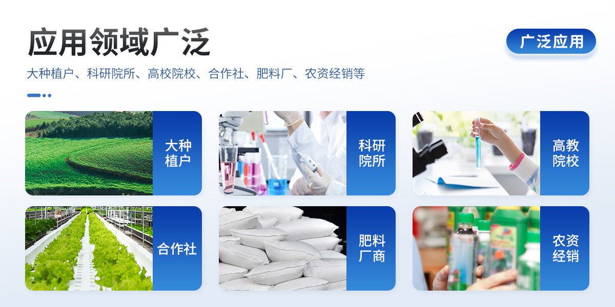 | 1、土壤養(yǎng)分: ●土壤總有機(jī)碳TOC、土壤碳氮比、銨態(tài)氮、土壤有效磷、土壤速效鉀、土壤硝態(tài)氮、土壤水解氮、土壤全氮、土壤全磷、土壤全鉀、土壤有機(jī)質(zhì)(丘林法)、土壤有機(jī)質(zhì)(浸提法)、PH值、含鹽量、水分。 ●土壤中微量元素:土壤鈣、土壤鎂、土壤硫、土壤硅、土壤硼、土壤鐵、土壤銅、土壤錳、土壤鋅、土壤氯; ●土壤重金屬:土壤鉛、土壤砷、土壤鎘、土壤鉻、土壤汞。 | 2、肥料養(yǎng)分: ●有機(jī)肥總有機(jī)碳TOC、有機(jī)肥碳氮比、全氮、有機(jī)肥全磷、有機(jī)肥全鉀、有機(jī)肥硝態(tài)氮、有機(jī)肥速效磷、有機(jī)肥速效鉀、有機(jī)肥酸解氮、有機(jī)質(zhì); ●復(fù)合肥碳氮比、全氮、復(fù)合肥全磷、復(fù)合肥全鉀; ●水溶肥碳氮比、全氮、水溶肥全磷、水溶肥全鉀; ●葉面肥碳氮比、全氮、葉面肥全磷、葉面肥全鉀; ●水溶性腐植酸(風(fēng)化煤)、水溶性腐植酸(褐煤)、水溶性腐植酸(泥炭)、游離態(tài)腐植酸(風(fēng)化煤)、游離態(tài)腐植酸(褐煤)、游離態(tài)腐植酸(泥炭); ●單質(zhì)肥:氮肥中銨態(tài)氮、肥料硝態(tài)氮、尿素氮、縮二脲、磷肥中磷、磷肥中水溶性磷、鉀肥中鉀; ●各種肥料微量元素:肥料鈣、肥料鎂、肥料硫、肥料硅、肥料硼、肥料鐵、肥料銅、肥料錳、肥料鋅、肥料氯; ●肥料重金屬:肥料鉛、肥料砷、肥料鎘、肥料鉻、肥料汞。 |