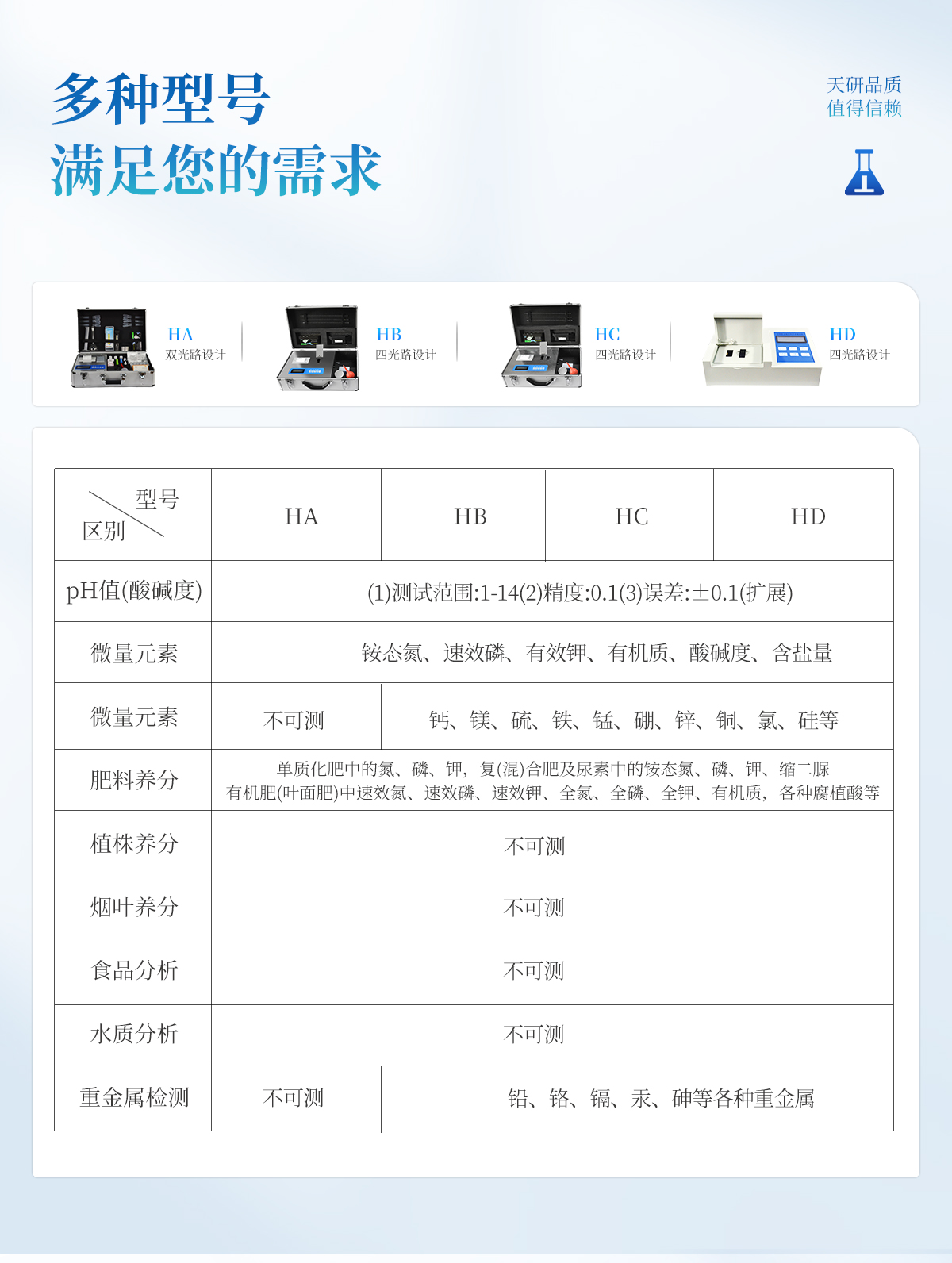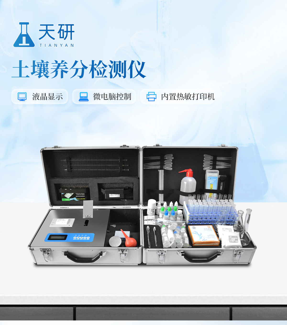 | 《機箱/藥劑一體式鋁合金機箱》專業(yè)設(shè)計,便于攜帶、堅固耐用,配套成套附件及成品藥劑 | 微電腦控制,數(shù)字化線路、程序化設(shè)計,液晶顯示,交直流兩用,可野外流動測試。 | 分辨率:0.001,觸摸式按鍵,內(nèi)置新一代熱敏打印機,可打印測試結(jié)果。 | 可檢測化肥、有機肥(含葉面肥、水溶肥、噴施肥等)中的速效氮、速效磷、有效鉀、全氮、全磷、全鉀、有機質(zhì)、酸堿度,鈣、鎂、硫、鐵、錳、硼、鋅、銅、氯、硅等各種中微量元素以及鉛、鉻、鎘、汞、砷等各種重金屬含量。 | 采用高亮LED燈光源、雙撥輪濾光式處理技術(shù),保證光源波長穩(wěn)定, 硅半導(dǎo)體作為信號接收系統(tǒng),壽命長達10萬小時級別。光源穩(wěn)定,重現(xiàn)性好,準確度高。 | 比色槽部分采用單通道設(shè)計,無機械位移及磨損,光路測試定位**,保證測定結(jié)果精度。 | 采用高精度濾光片技術(shù),自主分析方法,保證檢測結(jié)果優(yōu)于國標要求。 | 肥料打印結(jié)果為百分含量,測試誤差小于0.5%。 |