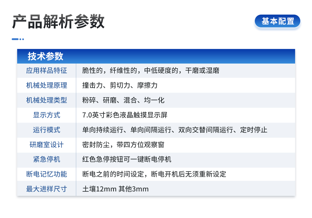 | 應(yīng)用領(lǐng)域:土壤、地質(zhì)、環(huán)保、第三方檢測(cè)、農(nóng)牧業(yè)、農(nóng)產(chǎn)品質(zhì)量、資源與環(huán)境等,土壤制樣、重金屬分析 | 應(yīng)用樣品特征:脆性的,纖維性的,中低硬度的,干磨或濕磨 | 儀器機(jī)械處理原理:撞擊力、剪切力、摩擦力 | 儀器機(jī)械處理類型:粉碎、研磨、混合、均一化 | 控制系統(tǒng):觸摸屏、無線遙控 | 遠(yuǎn)程遙控:標(biāo)配無線遙控器,可遠(yuǎn)距離控制研磨機(jī)的啟動(dòng)、停止、加速、減速以及可切換三種運(yùn)行模式(單向持續(xù)運(yùn)行,單向間隔運(yùn)行,雙向交替間隔運(yùn)行) | 顯示方式:7.0寸彩色液晶顯示屏,可顯示、觸控操作運(yùn)行模式、運(yùn)行時(shí)間、轉(zhuǎn)速、交替運(yùn)行間隔 | 運(yùn)行模式:?jiǎn)蜗虺掷m(xù)運(yùn)行、單向間隔運(yùn)行、雙向交替間隔運(yùn)行、定時(shí)停止 | 連續(xù)運(yùn)行時(shí)間設(shè)定:0.1~9999.9分鐘 | 交替、單向間隔暫停時(shí)間設(shè)定:0.1~9999.9分鐘 | 主盤轉(zhuǎn)速:50-450min | 研磨罐轉(zhuǎn)速:100-900min | 傳動(dòng)比(行星盤、研磨罐):1:2 | 可連續(xù)工作(滿負(fù)荷):90h | 緊急停機(jī):紅色急停按鈕可一鍵斷電停機(jī) | 斷電記憶功能:斷電之前的時(shí)間設(shè)定,斷電開機(jī)后無須重新設(shè)定 | 過載保護(hù)功能:有 | 研磨室設(shè)計(jì):密封防塵,帶四方位觀察窗 | 同時(shí)處理樣品種數(shù):4種 | 適用研磨罐:本機(jī)是新款通用型,100ml、250ml、500ml三種規(guī)格研磨罐均可使用,可根據(jù)客戶需求同時(shí)放不同規(guī)格的罐;對(duì)角對(duì)稱即可(4個(gè)研磨罐為一套)。 | **進(jìn)樣尺寸:土壤12mm 其他3mm | 研磨罐配球量:罐子容積的三分之一 | **裝樣量:研磨罐容積的三分之二 | 出樣粒度:*小可達(dá)0.1um(即1.0×10mm-4) | 研磨罐材質(zhì):瑪瑙、陶瓷、聚四氟乙烯、氧化鋯、聚氨酯、不銹鋼、尼龍、碳化鎢、硬質(zhì)合金等可選(常用瑪瑙、氧化鋯研磨罐) | 研磨球材質(zhì):瑪瑙、氧化鋯、不銹鋼、陶瓷、硬質(zhì)合金、碳化硅等 | 研磨球直徑:3、5、10、15、20mm(根據(jù)實(shí)際需求配置) | 電源端口:國標(biāo)、歐標(biāo)、美標(biāo)、英標(biāo)等 | 電機(jī)轉(zhuǎn)速、功率、電壓:1400rpm、0.75kw、220V±10%單相,50/60Hz | 凈重:80kg | 尺寸(長(zhǎng)寬高):756*484*488mm | 噪聲描述:60dB | 防護(hù)等級(jí):IP60 | 標(biāo)準(zhǔn)配置:研磨儀主機(jī):1臺(tái); | 研磨罐鎖緊裝置:1套4個(gè); | 250ml研磨機(jī)研磨罐保護(hù)裝置:1套4個(gè); | 100ml研磨機(jī)研磨罐保護(hù)裝置:1套4個(gè); | 電源線:1根; | 說明書:1本; | 保修卡:1張; | 合格證:1張 |