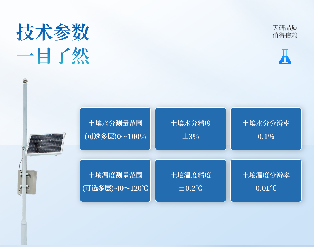 | 主控制器技術(shù)參數(shù) 數(shù)據(jù)存儲(chǔ)空間:≥100000條 記錄間隔:1分-24小時(shí)可調(diào) 數(shù)據(jù)傳輸:無線傳輸 工作環(huán)境:-30℃~80℃ 供電方式:220v市電、太陽(yáng)能供電系統(tǒng)同時(shí)使用 | 傳感器技術(shù)參數(shù) 空氣濕度:0~100% 精度:±3% 分辨率:0.1% 光照 :-20~80℃ 精度:±2% 雨量 :-20~80℃ 承雨口徑:φ200mm 精度:±2% 分辨率:0.2mm 土壤水分:測(cè)量精度:±3% 工作溫度范圍:-20℃~50℃ 土壤ec:測(cè)量精度:±4% 土壤EC測(cè)量范圍:0.2~12mS/cm 土壤溫度:精度:±0.2℃ 測(cè)量范圍:-40℃~120℃ |
